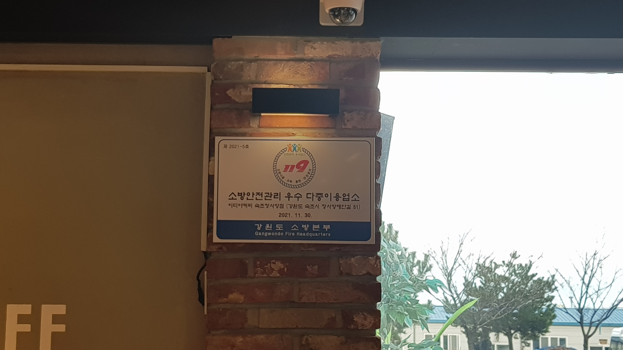 속초소방서(서장 김재석)는 2021년 11월 30일 소방안전관리 다중이용업소 우수업소로 선정된 이디야커피 속초장사항점 (장사항해안길 51)에 방문해 안전관리 우수업소 전수식을 가졌습니다.