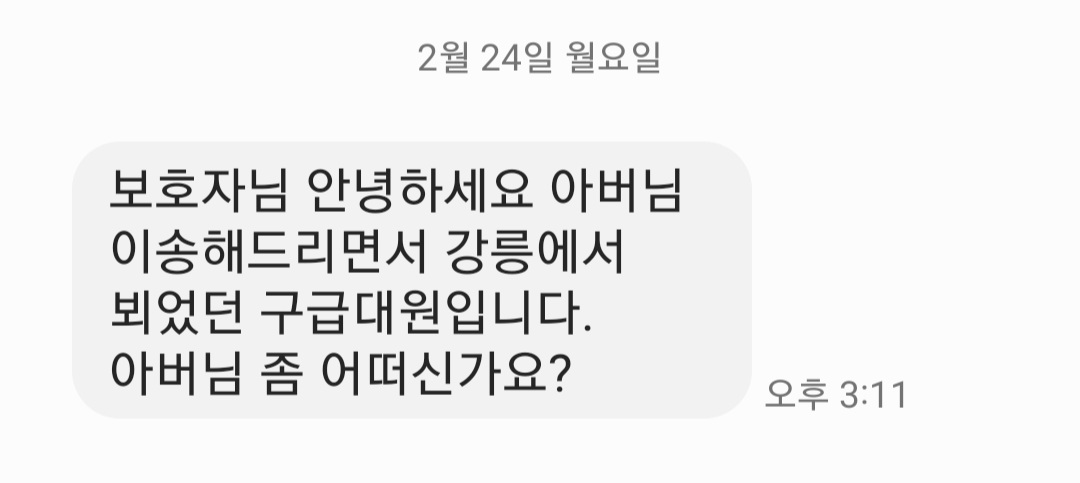 “보호자님 안녕하세요. 아버님을 이송해 드리면서 강릉에서 뵈었던 구급대원입니다. 아버님은 어떠신가요?”