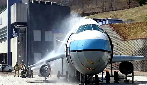 강원도소방학교에서 항공기 화재 진압훈련이 펼쳐지고 있다.
