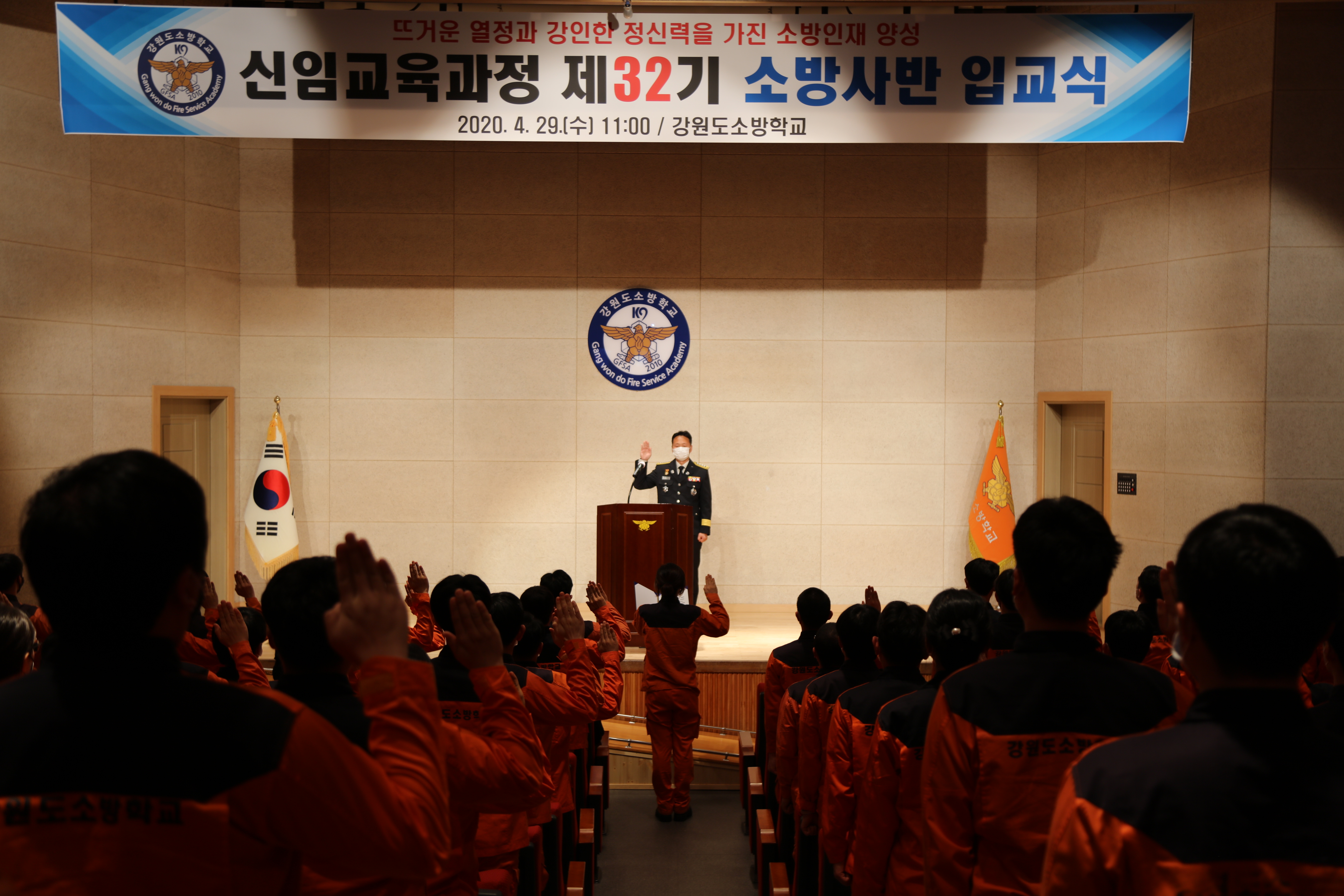 강원도소방학교(학교장 박태원)는 2020년 4월 29일 수요일 오전 11시 교내 대강당에서 신임교육과정 제32기 소방사반에 대한 입교식 행사를 개최했다.