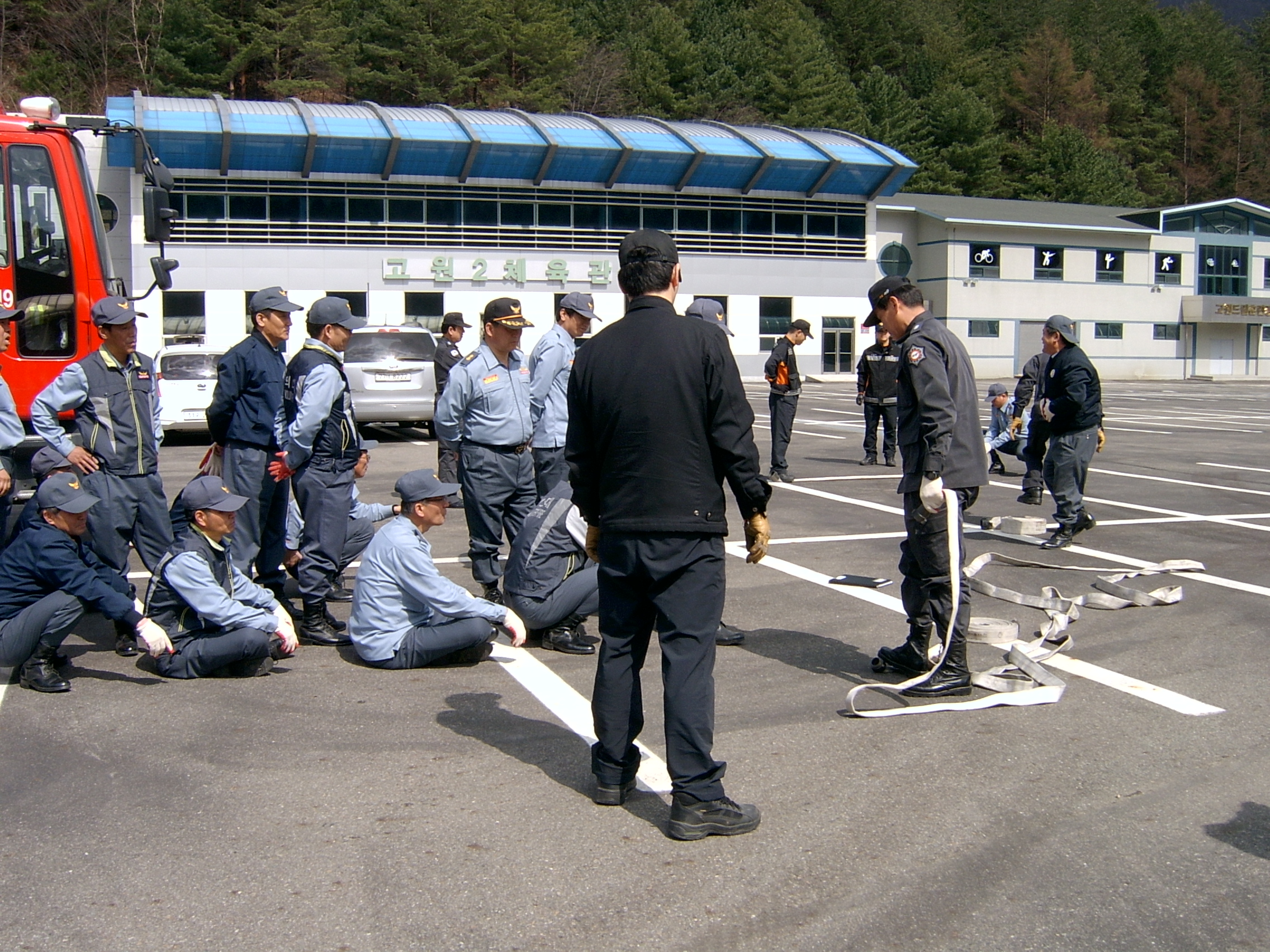 2012, 4월 18일 태백종합경기주차장의 넓은 공터에서 실전을 방불케하는 남성의용소방대전원이 참석한가운데 4월 정기교육이 있었습니다 .