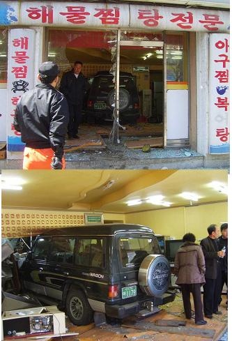 14일 오후 12시20분경 태백시 황지동 대산아파트 앞 사거리에서 갤로퍼 차량이 반대편 차선을 넘어 식당안으로 돌진하는 사고가 발생하여 운전자, 식당 주인이 다쳐 병원으로 이송되었습니다.