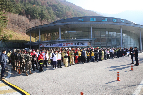 태백소방서는 지난 16일 오후 2시 태백시 문곡소도동 소재 고원체육관에서 대형재난에 대비하기 위한 ‘2022년 긴급구조 종합훈련’을 실시했다.
