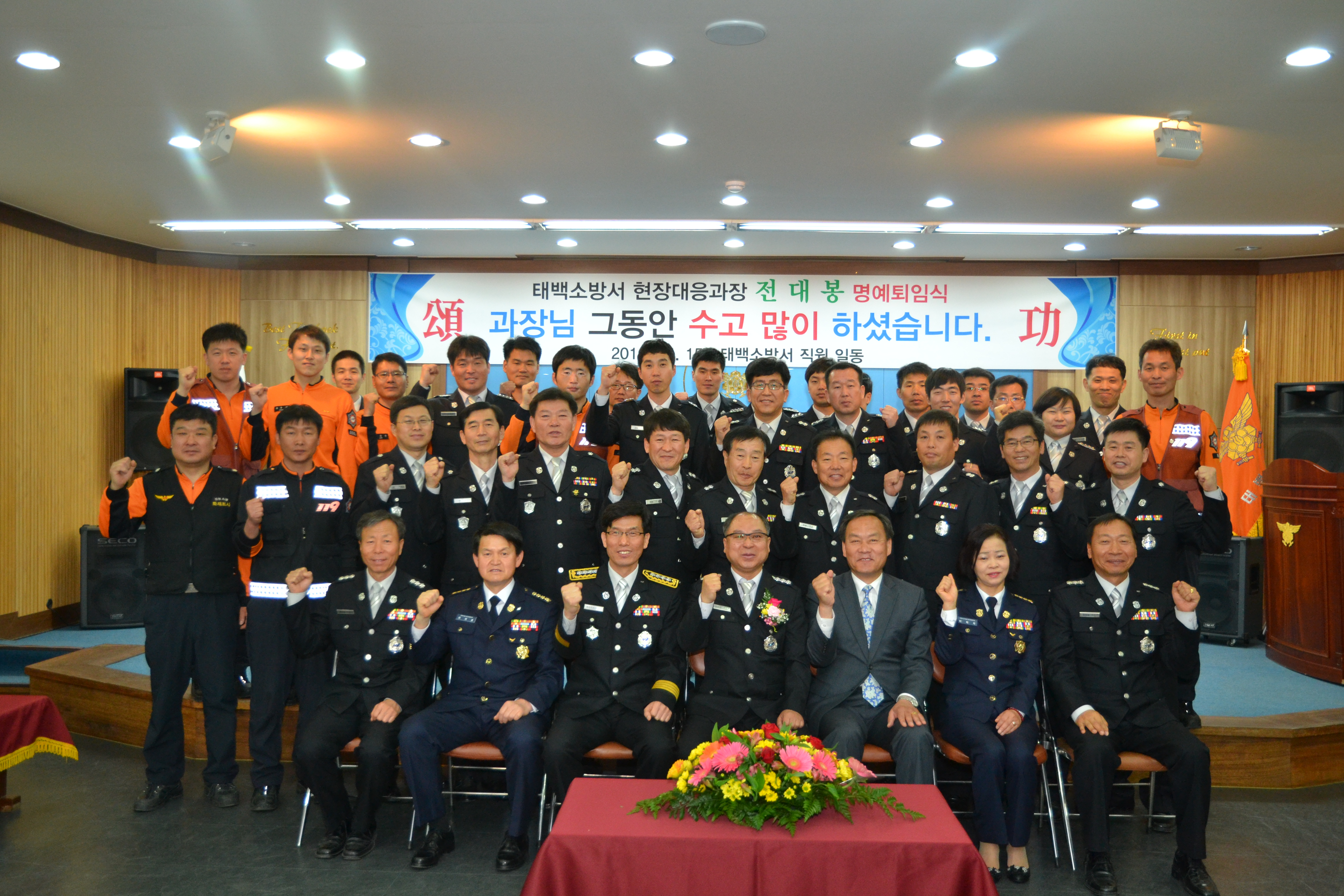 태백소방서(서장 이동학)는 15일 오전 11시 태백소방서 직원 과 태백의용소방대연합회장들이 참석한 가운데 공직생활을 마감하는 전대봉 현장대응과장의 명예 퇴임식을 가졌다.