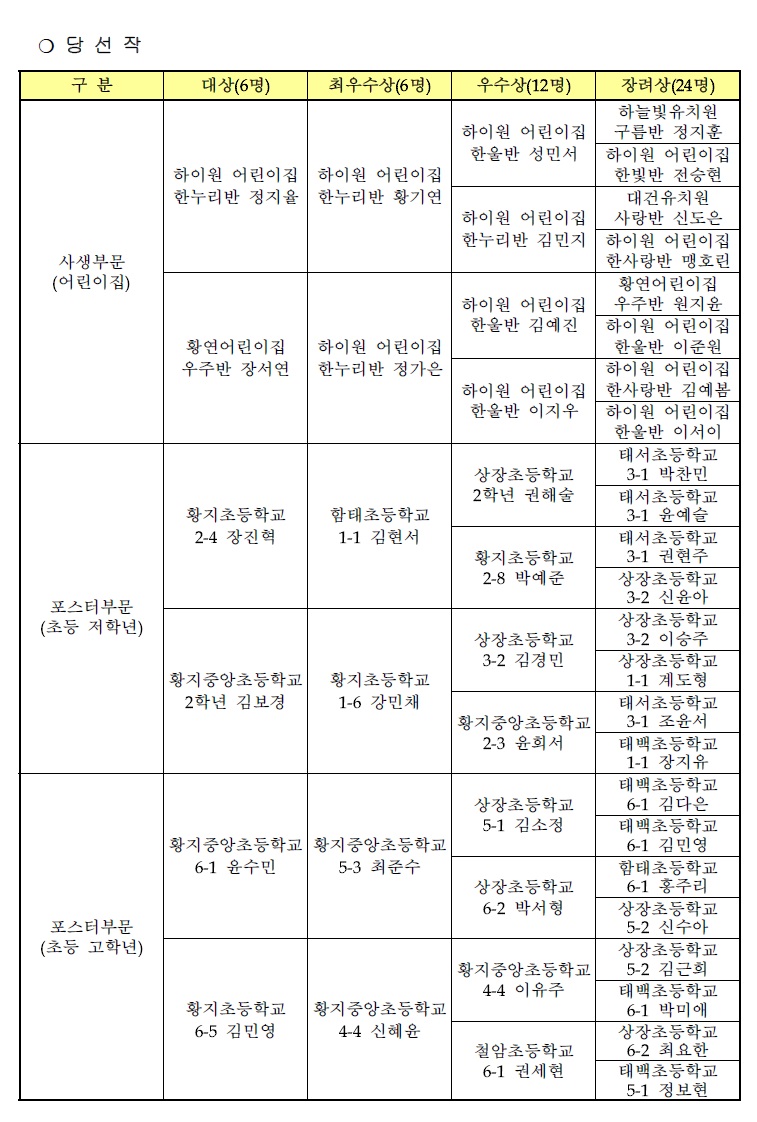 수상자는 ▲ 유치부 정지율(하이원 어린이집), 장서연(황연어린이집) ▲ 초등부 저학년 장진혁(황지초 2학년), 김보경(황지중앙초 2학년) ▲ 초등부 고학년 윤수민(황지중앙초 6학년), 김민영(황지초 6학년)학생이 각각 대상으로 선정됐으며, 나머지 작품42점을 입상작으로 선정됐다.