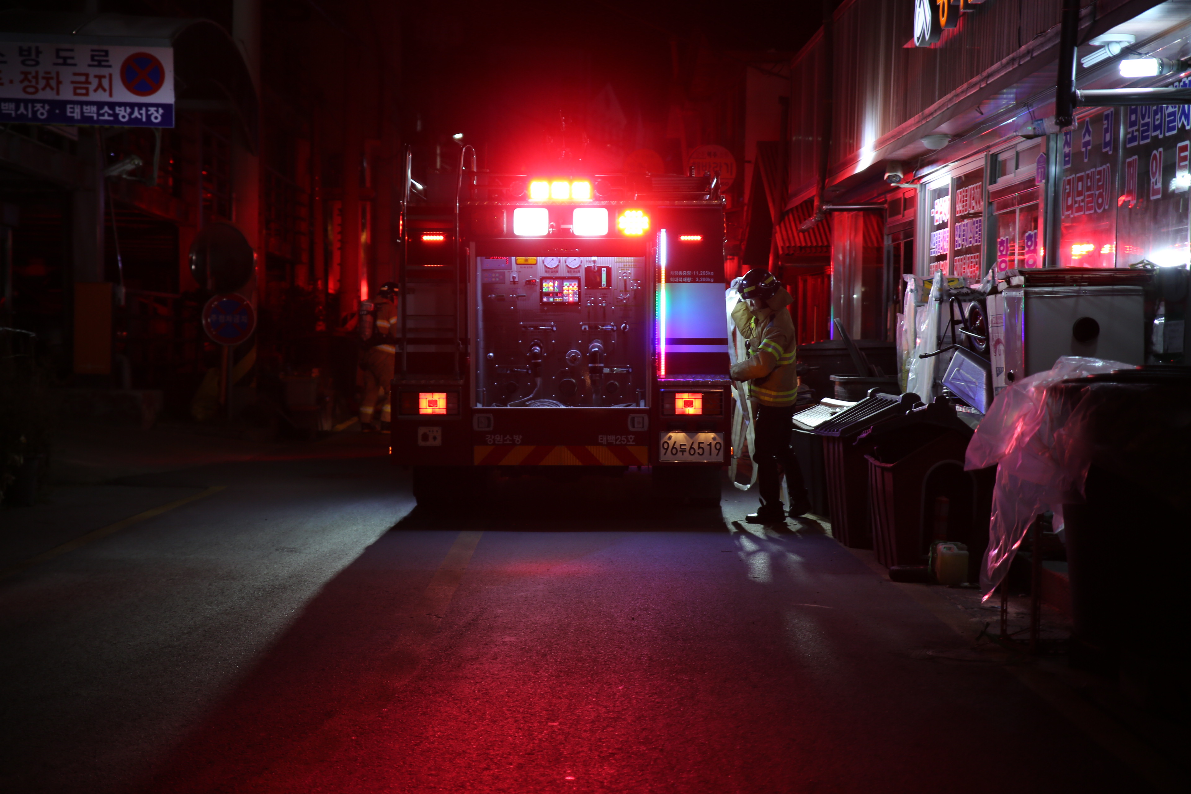 태백소방서(서장 석교준)는 24일 오후17시 황지자유시장에서 소방공무원 및 시장 자위소방대 40명이 참가해 야간 가상화재진압훈련을 실시했다.