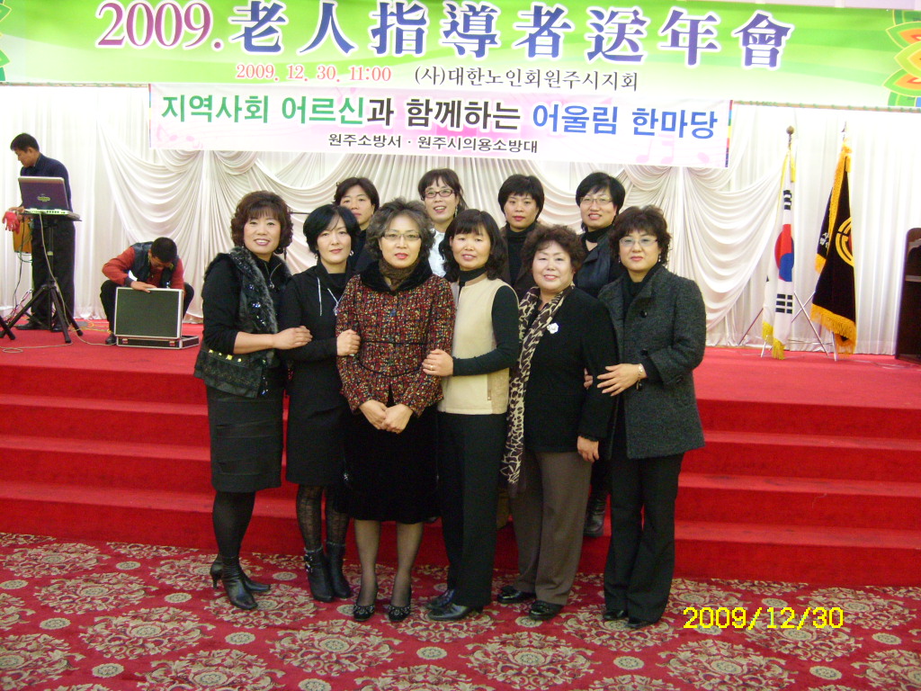 원주여성의용소방대에서는 2009년 12월 30일 (수)에 중앙웨딩홀에서 원주시노인복지회 회원님들을 모시고 송년회 겸 위문공연 봉사활동을 하고 돌아 왔습니다.
