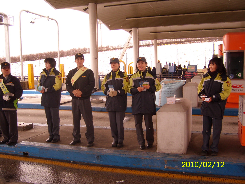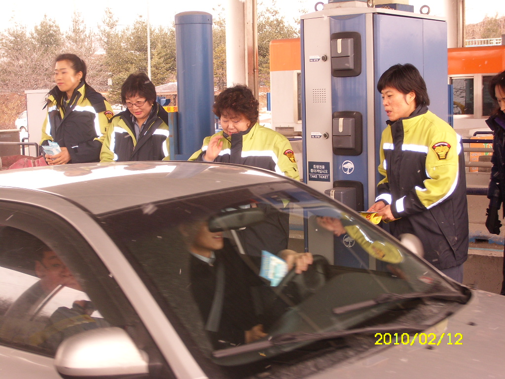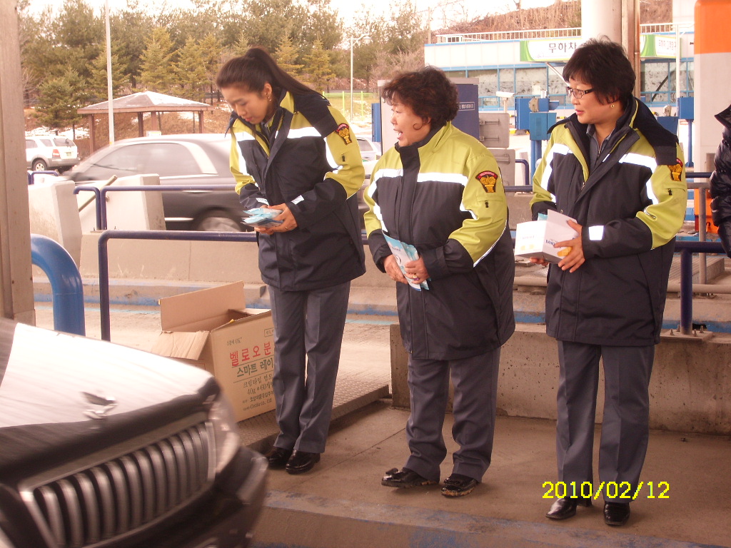 원주여성의용소방대에서는 박명자 부대장님 지휘하에 2010년 2월 12일 (금) 남원주IC에서 귀성객 차량 대상으로 화재예방 홍보 캠페인을 펼쳤습니다.