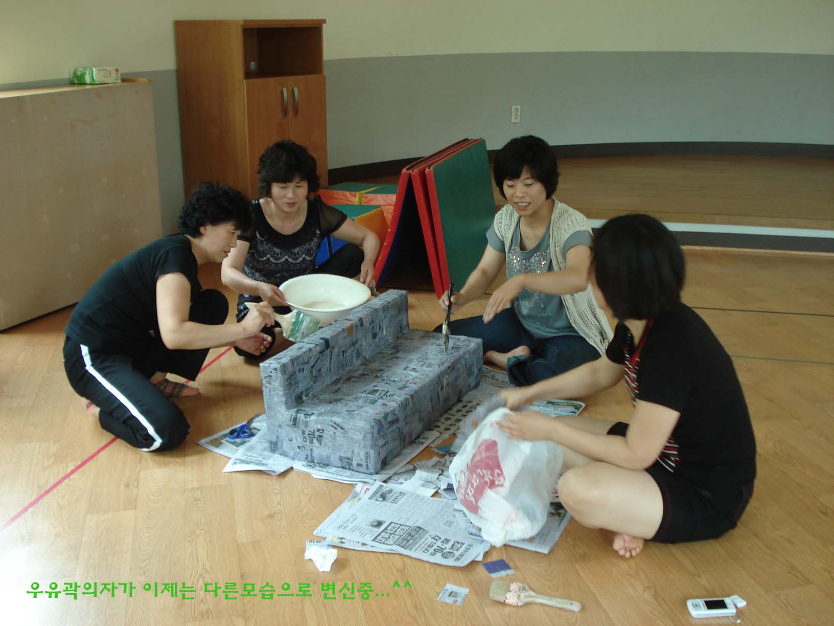 원주여성의용소방대(대장이현자)는 2010년 6월16일(수) 예찬어린이집 봉사를 다녀왔습니다. 매주수요일 마다 봉사하는 예찬어린이집에 오늘은 보급반(이광순반장님)이 다녀왔습니다. 오전 10시부터 청소를 하고 11시30분쯤 부터는 우유곽으로 어린이들 의자를 만들기 시작했습니다. 손바닥에 한조각씩 올려놓고 풀칠을해서 우유곽 모형틀에 겹겹이 붙이기 시작...... 어느덧 모양이 자리 잡았죠? 왁스칠하듯 풀을 발라놓고 다음을 기약하고 1시쯤에 예찬어린이집을 나왔습니다.