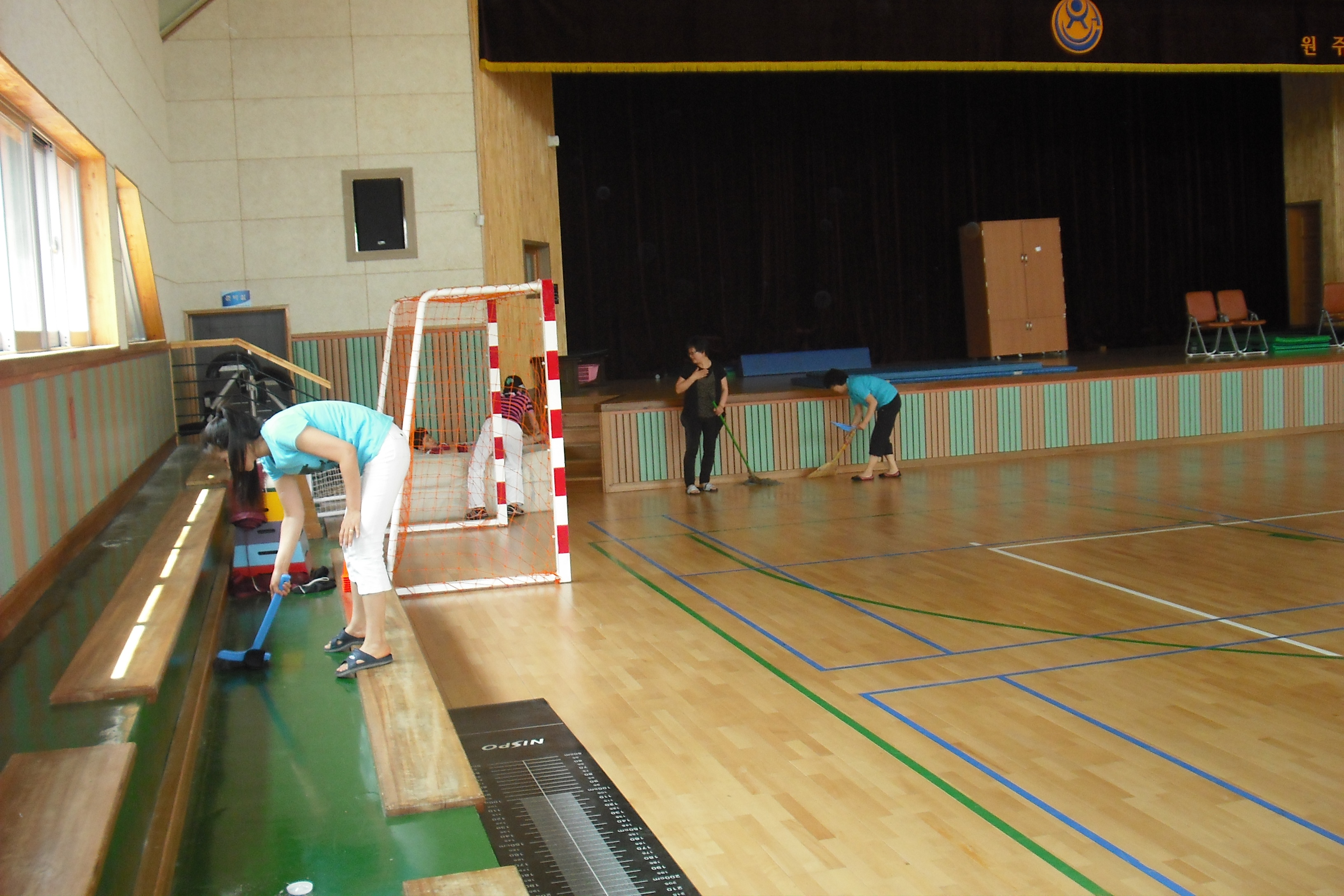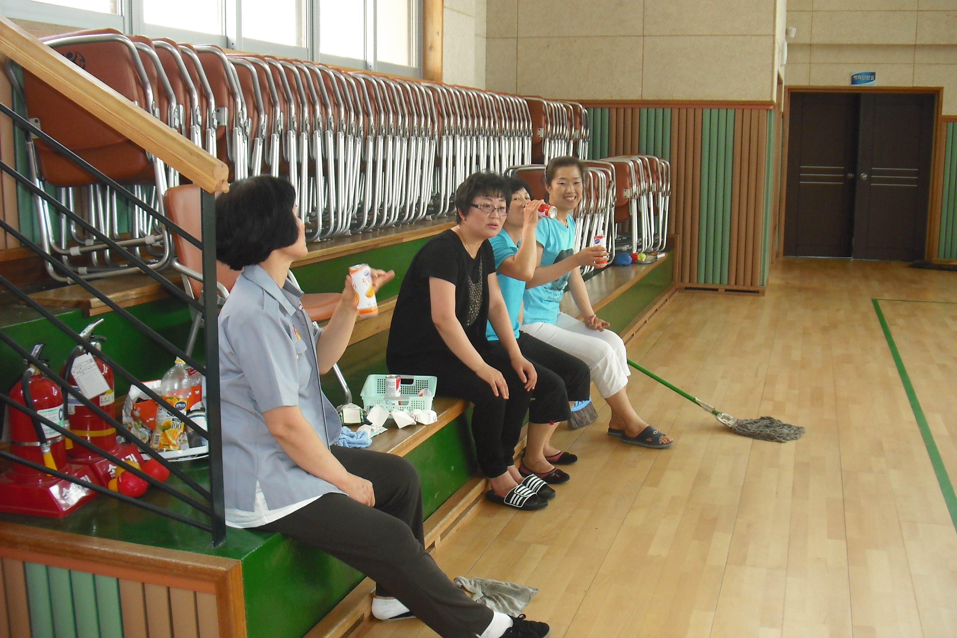 간발의 차이로 이광순반장님이 참석하셔서 도서관 정리를 마무리하고 10시30분부터 체육관으로 대청소하러 들어갔습니다. 운동기구정리, 먼지털기 빗자루로 구석구석 쓸기, 마대걸레로 밀고 다니기,.... 봉사담당선생님은 기름걸레로만 해도 된다하셨지만 어디 우리 어머님들이 순순히 시키는 일만 합니까 ㅋㅋㅋ 물걸레로 얼룩들을 닦아내고 대충 마음에 들때까지 고고씽 대원들 6명이 합심하니까 일도 금방 끝나네요. 선생님이 가져다 주신 시원한 음료도 정말 꿀맛이었지요 모두 더운날 고생들 많으셨습니다.^^