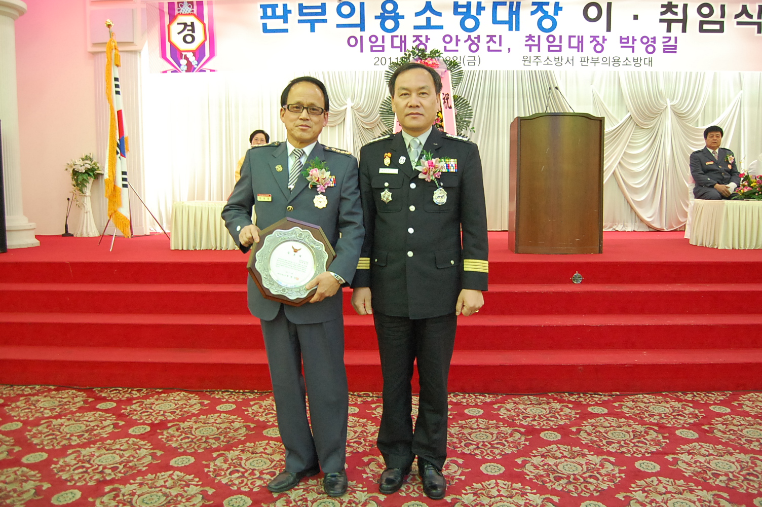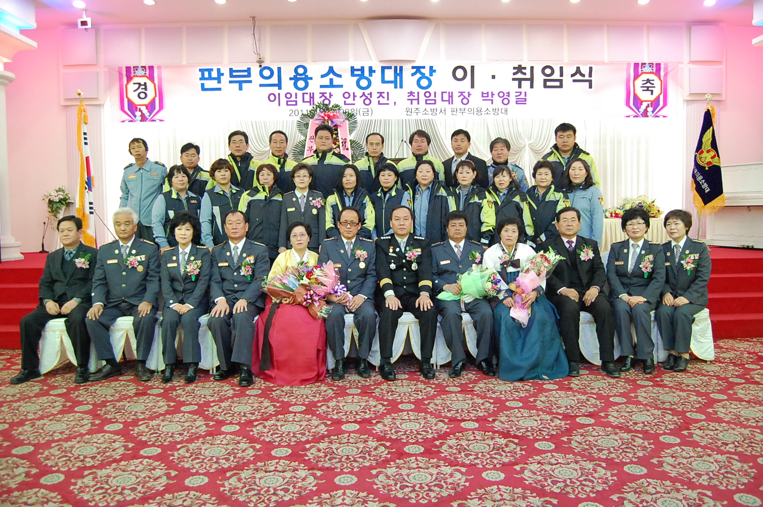 원주소방서(서장. 박창진)는 2011.01.28 (금) 11:00 - 중앙웨딩홀(개운동 소재)에서 제7대 판부의용소방대장 이취임식을 가졌습니다.