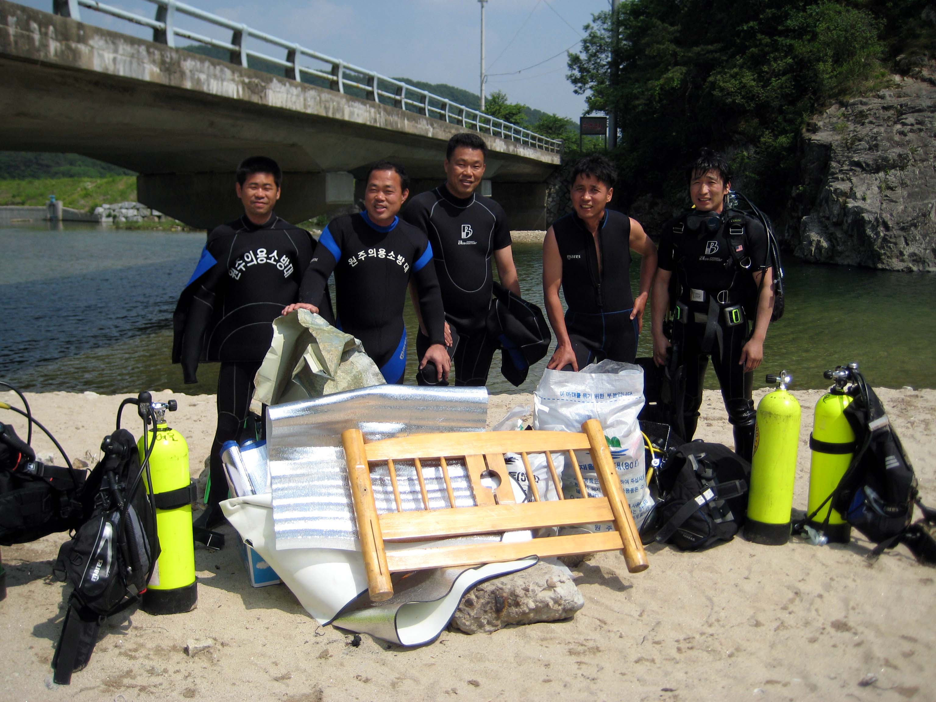 원주의용소방대(대장 조성일) 구조반 대원들은 6월2일 목요일 10시부터 16시까지 대원 30명이 참가한 가운데 원주시 산현리 칠봉유원지에서 단합대회 및 수중쓰레기 수거를 실시했습니다. 이날 쓰레기수거는 수중쓰레기 50L, 다리밑 야외에 널려져있던 쓰레기 300L를 수거했습니다