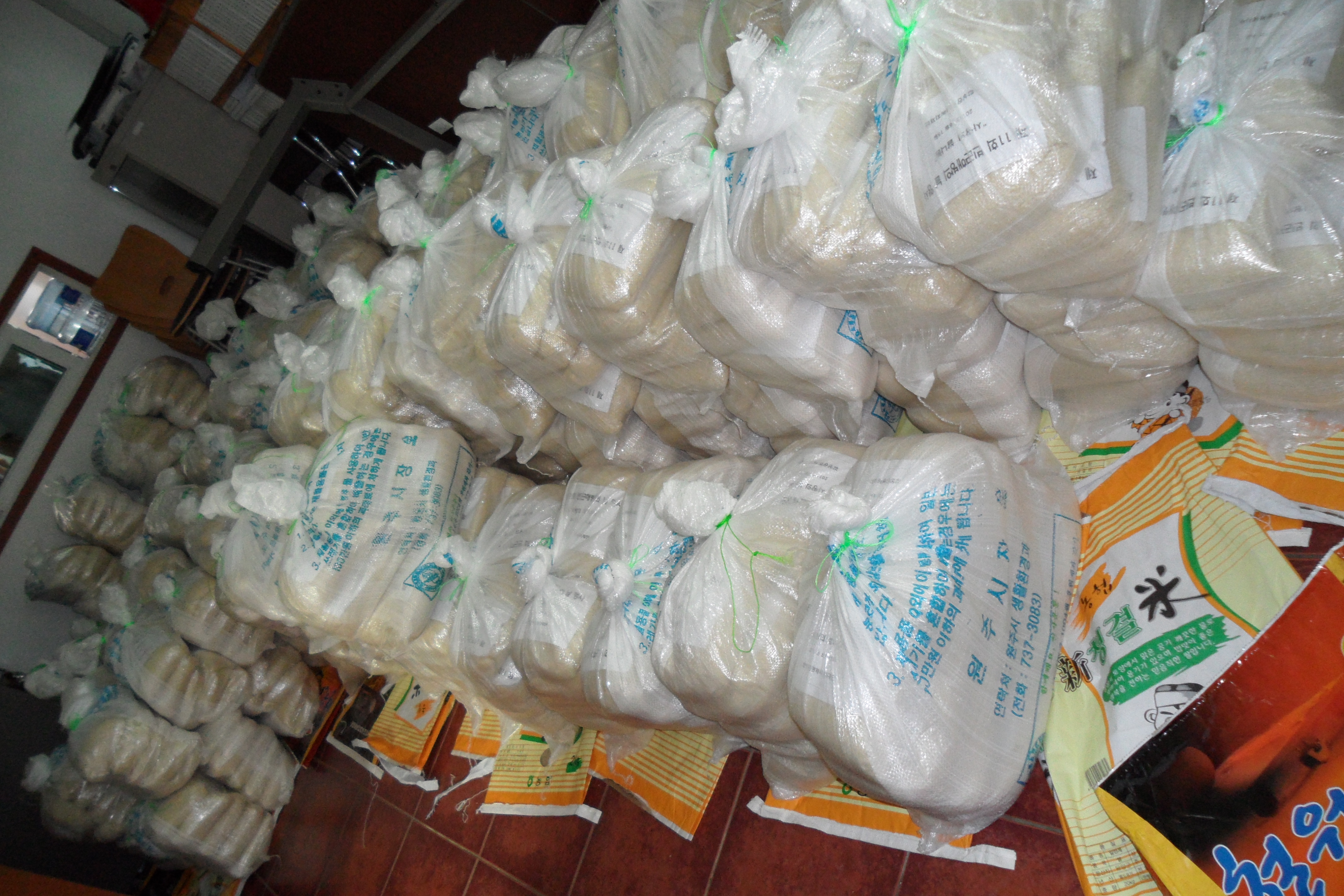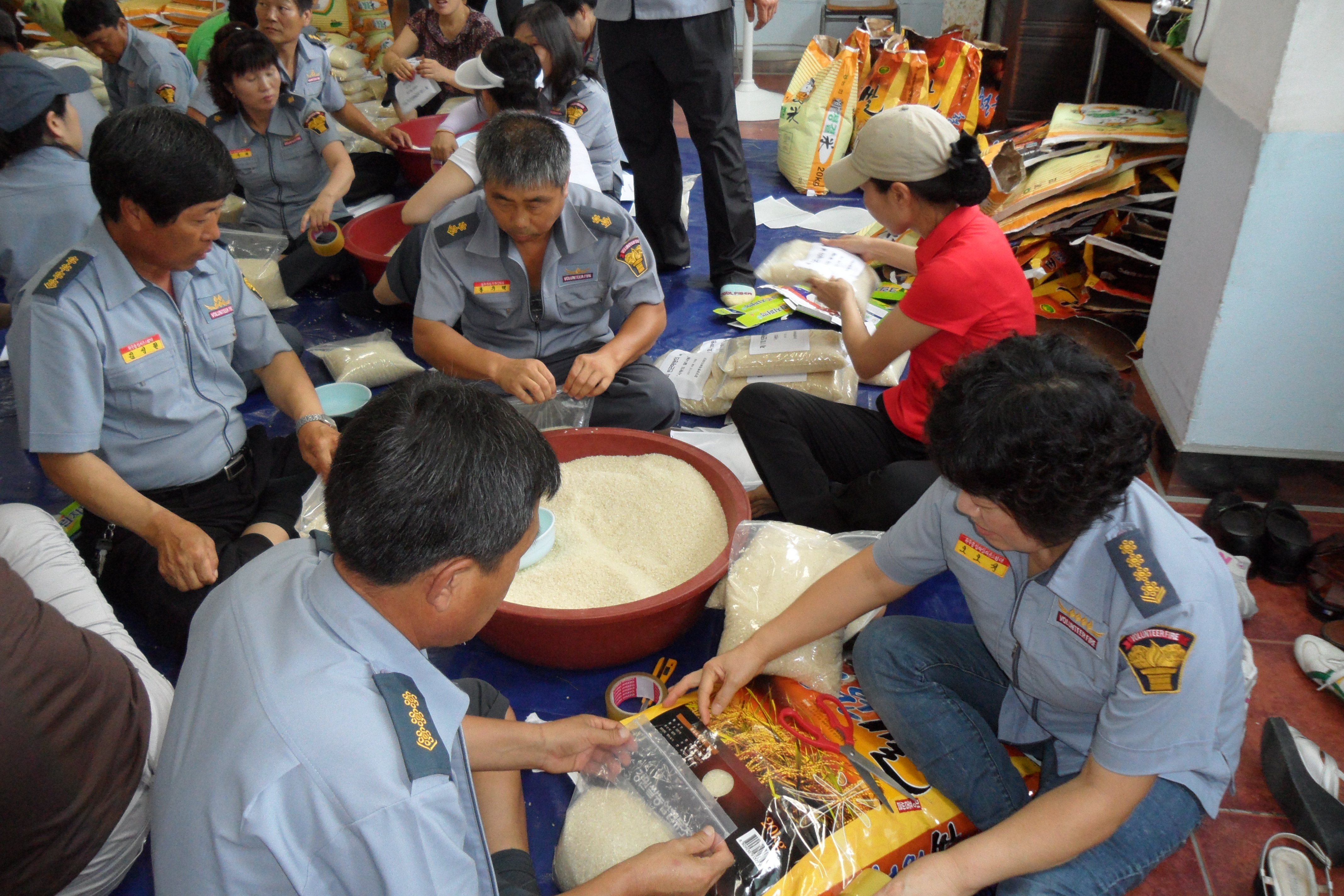 따라서 그 날 행사에 사용될 사랑의 쌀 소포장 작업을 하였는데 흥업남.여의용소방대를 비롯하여 각 대에서 3명이상씩 참여하였습니다. 일손이 많으니 산더미(?!)같던 쌀포대가 순식간에 바닥이 났습니다. 인해전술(???!!!)은 아주 많이 무섭습니다......ㅎㅎ