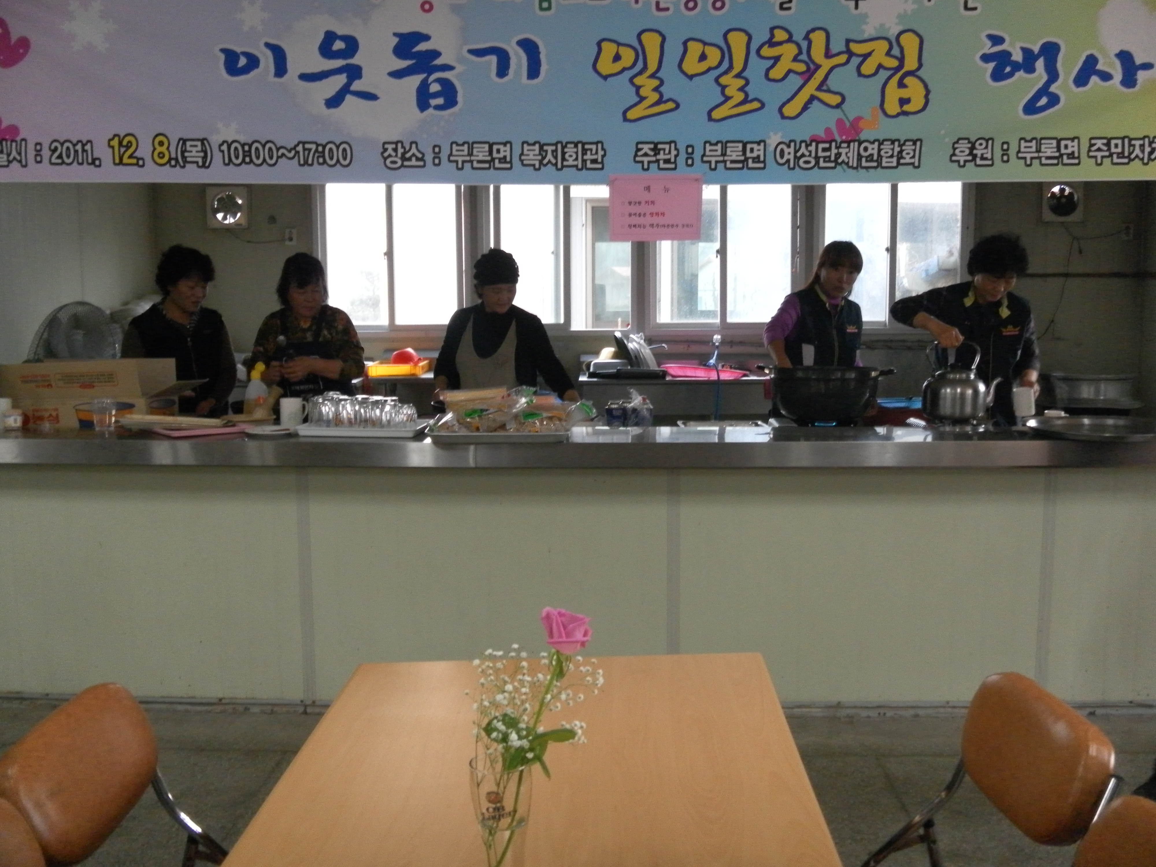 2011년12월8일 10시부터 17시까지 부론면내의 부론복지회관에서 여성대장 김윤수외 10명이 일일찻집을 운영하여, 모인 기금 전액을 관내 불우이웃 및 결손가정에게 전달할 예정입니다.