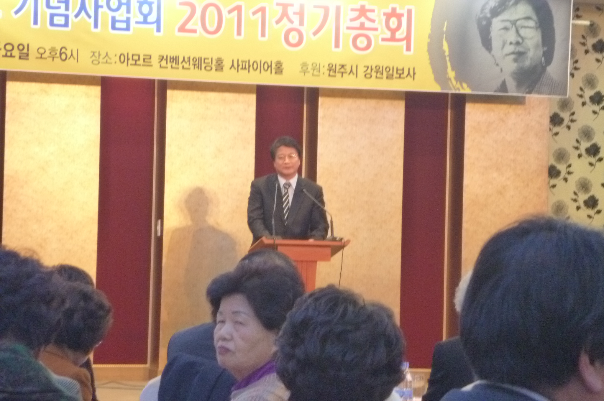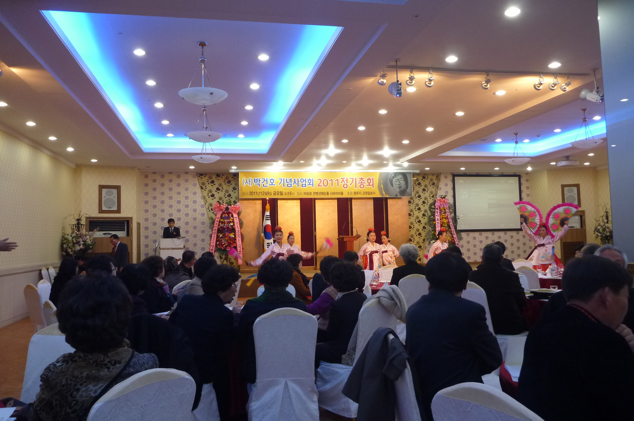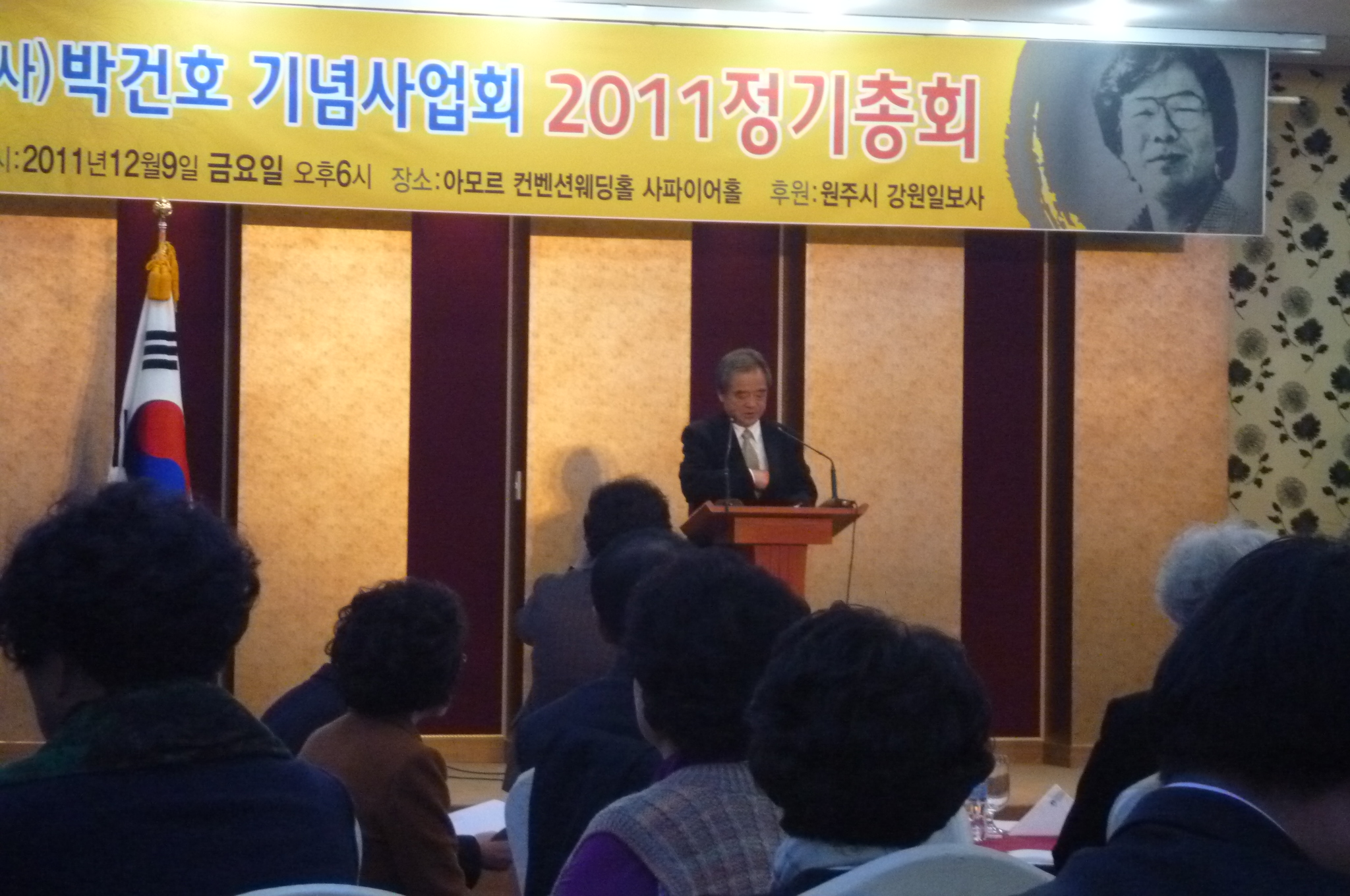 흥업여성대(대장오오석)에서는12월9일 오후6시~8시까지 오오석대장외 8명이 "박건호기념사업회2011년 정기총회"에 다녀왔습니다.흥업여성대의 박수준고문님이 이사장으로 계십니다.아모르컨벤션에서 2백여명의 회원과 내빈들이 참석한 가운데 성황리에 열렸습니다.그날이 바로 박건호선생의 네번째 기일이 었습니다.2007년12월9일에 작고하셨습니다.박건호선생의에 대한 선양사업이 시작된지도 횃수로 3년이 됐습니다.처음 뜻있는 분들 몇몇이 모여 시작한 선양사업이 벌써 여기까지 온것입니다.거거에 흥업여성대도 일조한다고 한다고 생각하니 뿌듯합니다.