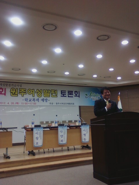 흥업여성대(대장오오석)에서는 2012년 4월 26일 오후3시부터 원주시청 다목적홀에서 열리는 `제6회 여성발전토론회'에 참석하과 왔습니다.원창묵원주시장님, 지은희 원주시여성단체협의회장,여성단체협의회원등 200여명이 참석하였습니다.자유롭고 안전한 지역사회를 만들이 위한 "학교폭력예방"을 주제로 토론이 진행되었습니다.학교폭력 예방을 위한 역활과 실천방안을 제안하고, 자유롭고 안전한 지역사회만들기 위해 저희 여성의용소방대원들도 힘써 돕겠습니다.