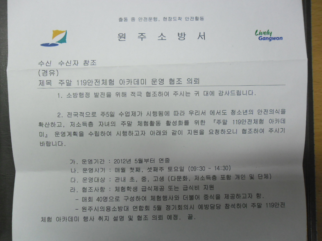 < 주말 119안전체험 아카데미 운영 협조 의뢰> 문서가 명륜센터에 있습니다.