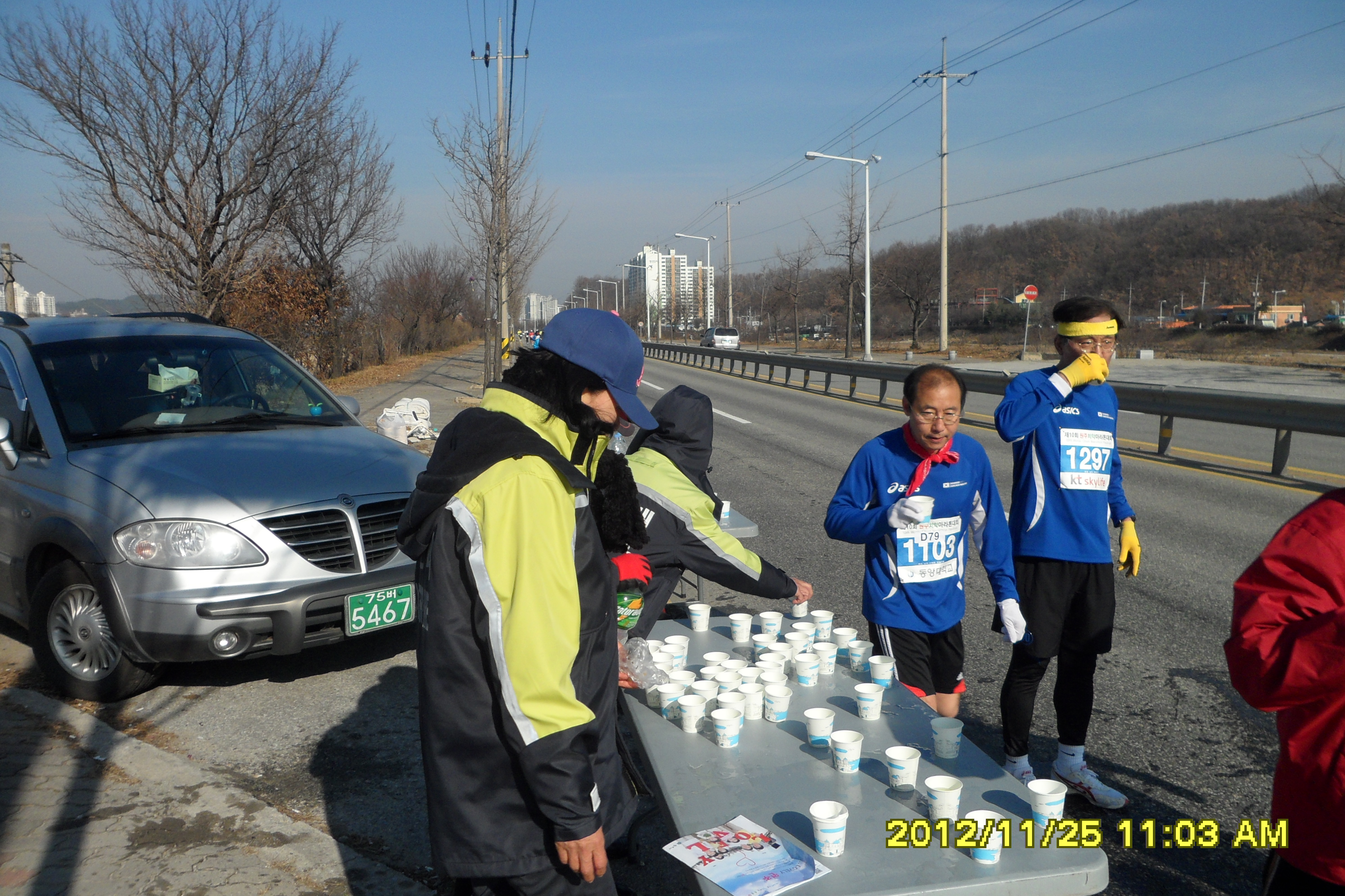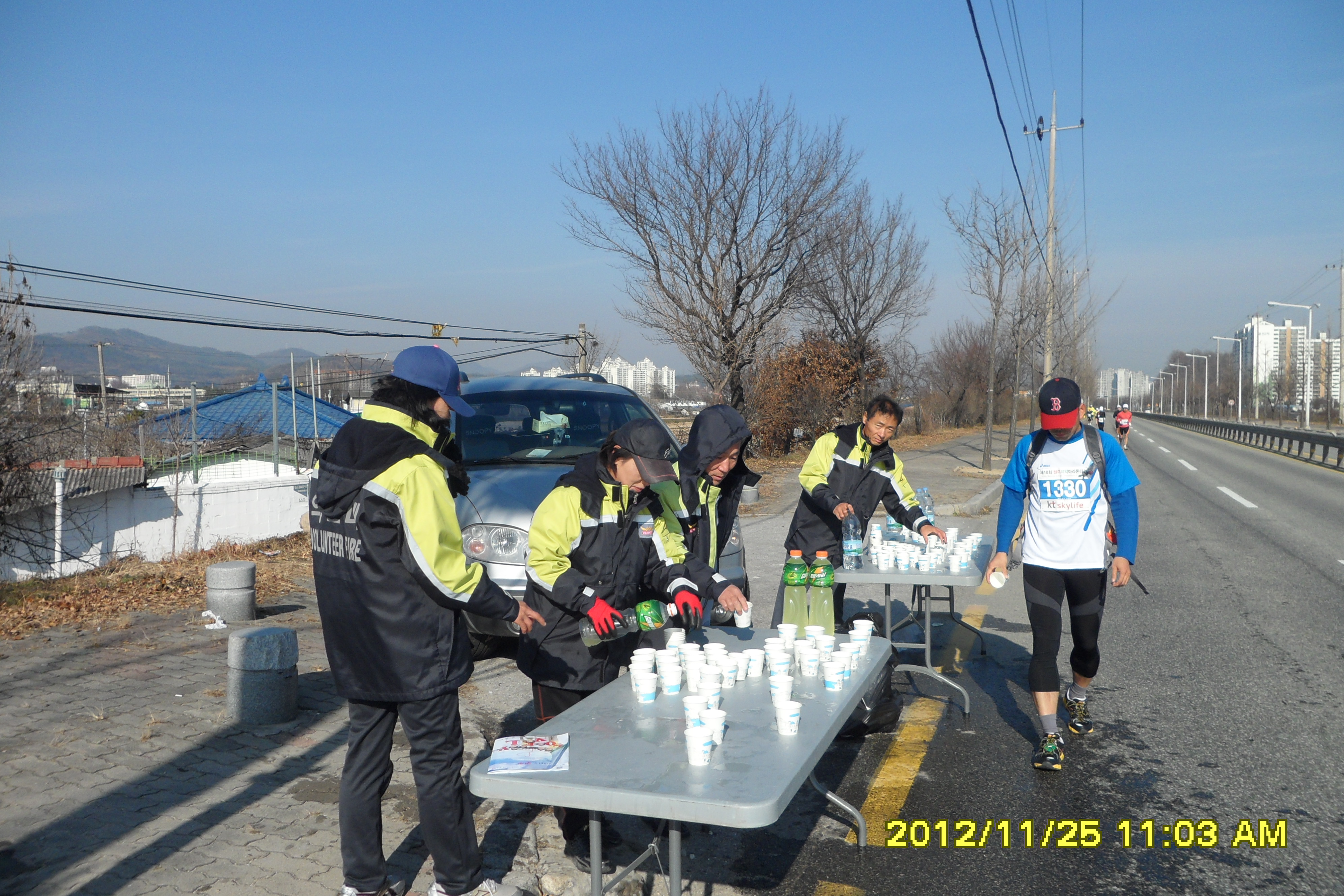 2012년 11월25일 지정 남여 의소대원6명은 원주에서 열리는 제10회 치악 마라톤대회에 열심히 달리고 있는 선수들에게 물과 음료수를 나누워주었습니다.