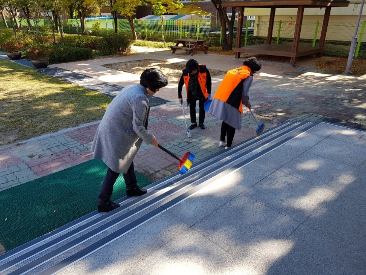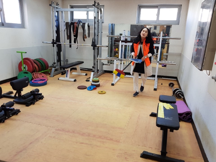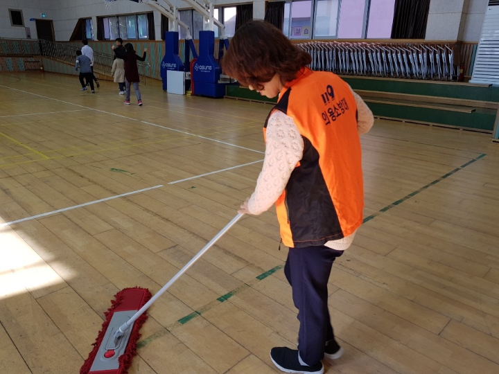 내용: 체육관 실내 바닥청소 및 입구먼지제거 쓰레기분리수거