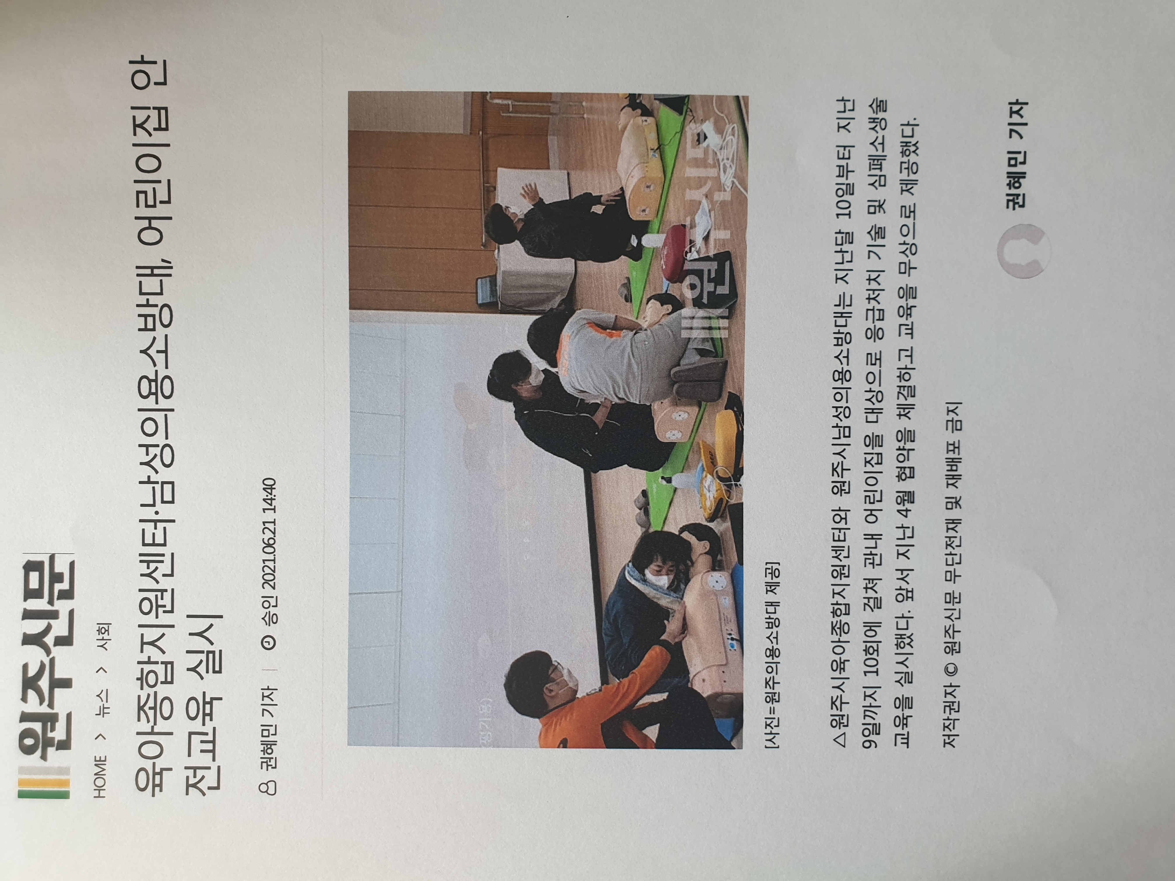 ●원주시육아지원종합센터 : 심폐소생술교육 관련 : 원주신문(6월21일)