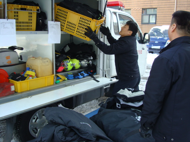 원주소방서(서장 박창진) 119구조대에서는 24일오후 수난구조차량 장비점검 및 곽호석(씨마스코리아 아이스다이빙강사)님을 초빙하여 27일 실시될 동계수난구조훈련에 대비한 아이스다이빙시 장비사용요령 및 주의사항에 대한 교육을 실시하였습니다.