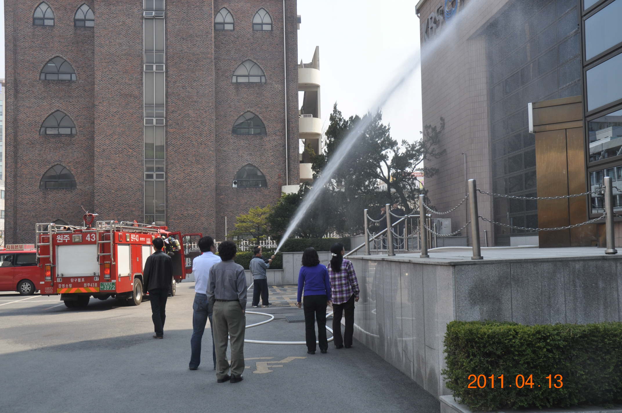 원주소방서(서장 박창진)는 4.14(수) 14:00 원주KBS를 대상으로 봄철 주요통신시설 합동소방훈련을 실시하였습니다. 무대부를 가상화점으로 하여 자위소방대의 초기진화훈련과 연기 배연을 위한 배연차 조작훈련을 하였습니다.