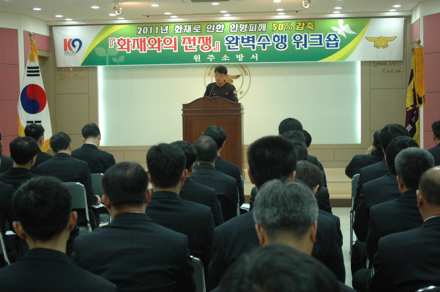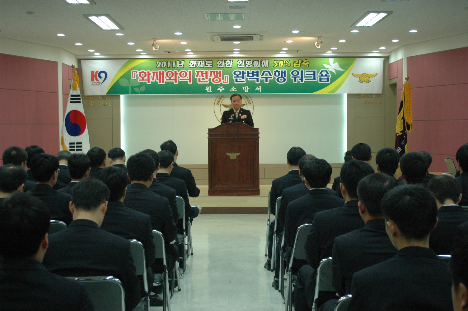 원주소방서(서장 박창진)는 2011. 5. 2(월) 09:00 본서 대회의실에서 전직원이 참여한 가운데 5월 월례조회 및 화재와의 전쟁 워크숍을 실시하였다.