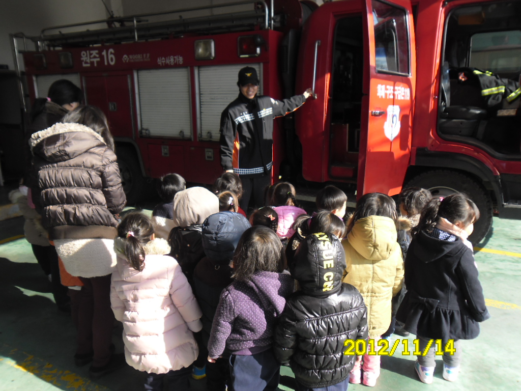 원주소방서(서장 김시균) 태장119안전센터에서는 2012. 11.14.(수)태장동 소재 칸타빌레어린이집 영유아 29명을 대상으로 소방안전교육을 실시하였습니다. 귀여운 아이들에게 소중한 안전 상식을 가르쳐 주고, 펌프차 및 구급차 탑승 체험등으로 의미 있는 시간을 보냈습니다.