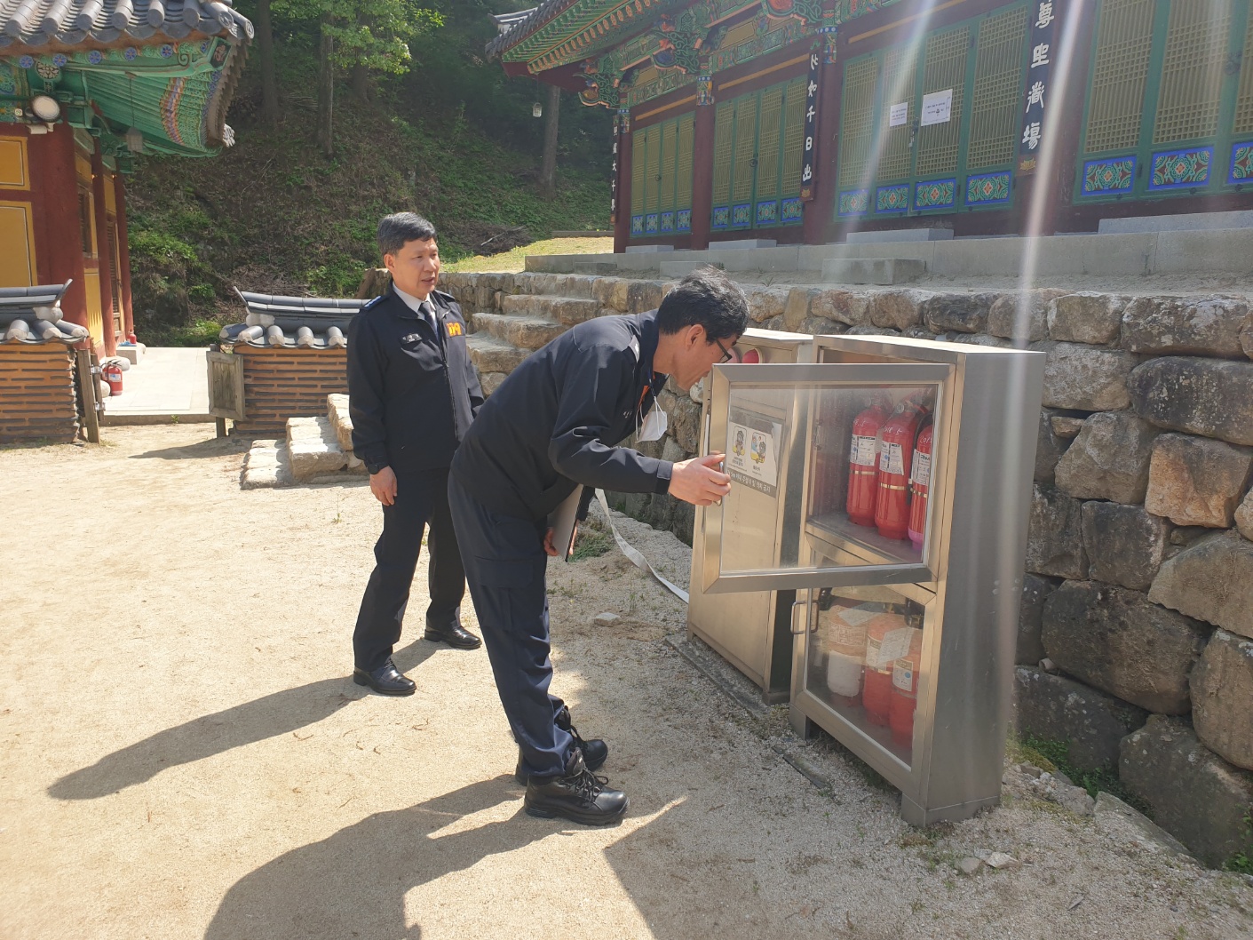 □ 사찰 주변과 내·외부를 확인하며 ▲금연 안내표지판 설치 및 소화기 비치 확인 ▲휴대용 진압장비(등짐펌프 등) 가용상태 확인 ▲소방차 진입 여부 확인 ▲관계자 시설물 안전관리 및 화재 초기대처·대피요령 교육 등의 내용으로 컨설팅을 진행했다.