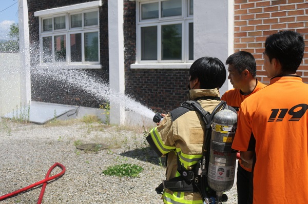 □ 주요 내용은 ▲완강기 및 소소심교육 ▲소화전 방수, 방화복 착용 체험 ▲지진, 화재대피 체험 등을 실시 했다.