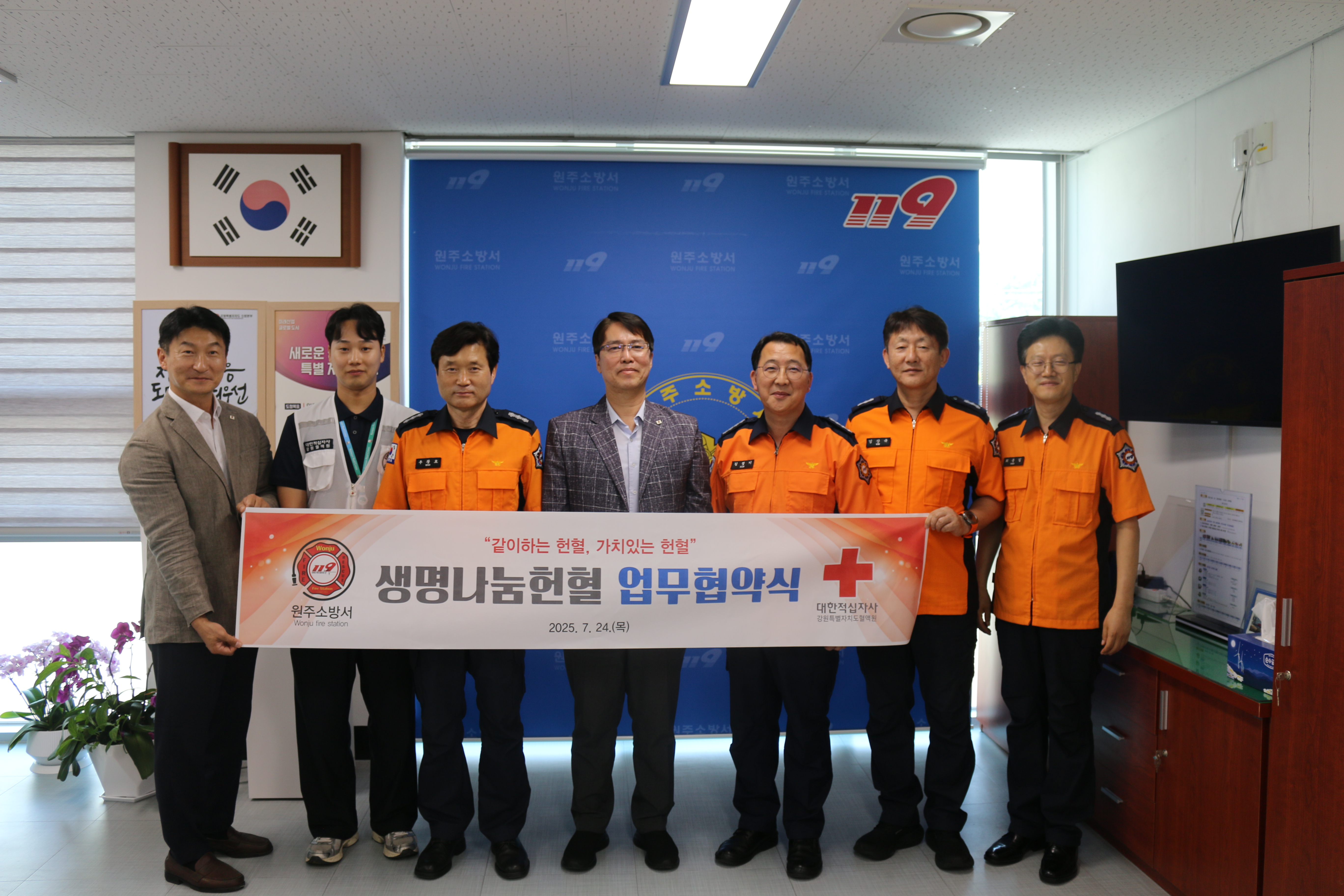 원주소방서(서장 김정기)는 24일 오후 2시 소방서에서 대한적십자사 강원특별자치도혈액원과 생명나눔 실천 협약(MOU)을 체결했다.