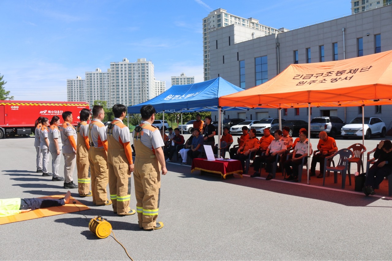 ◯ 원주소방서(서장 김정기)는 22일 오전 10시 30분 본서 뒷마당에서 ‘제11회 강원특별자치도 의용소방대 소방기술경연대회’에 참가하는 의용소방대 선수단 시연회를 갖고 격려했다.