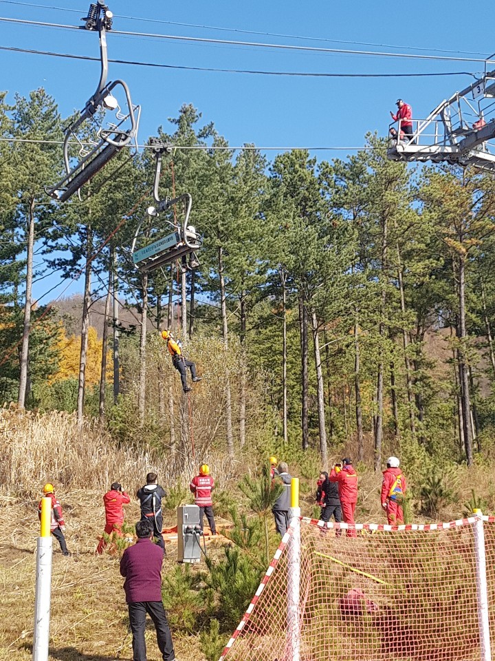 원주소방서(서장 이병은) 구조대는 22일 오크밸리 스키장에서 리프트 고립사고에 대비한 인명구조훈련을 실시했습니다.