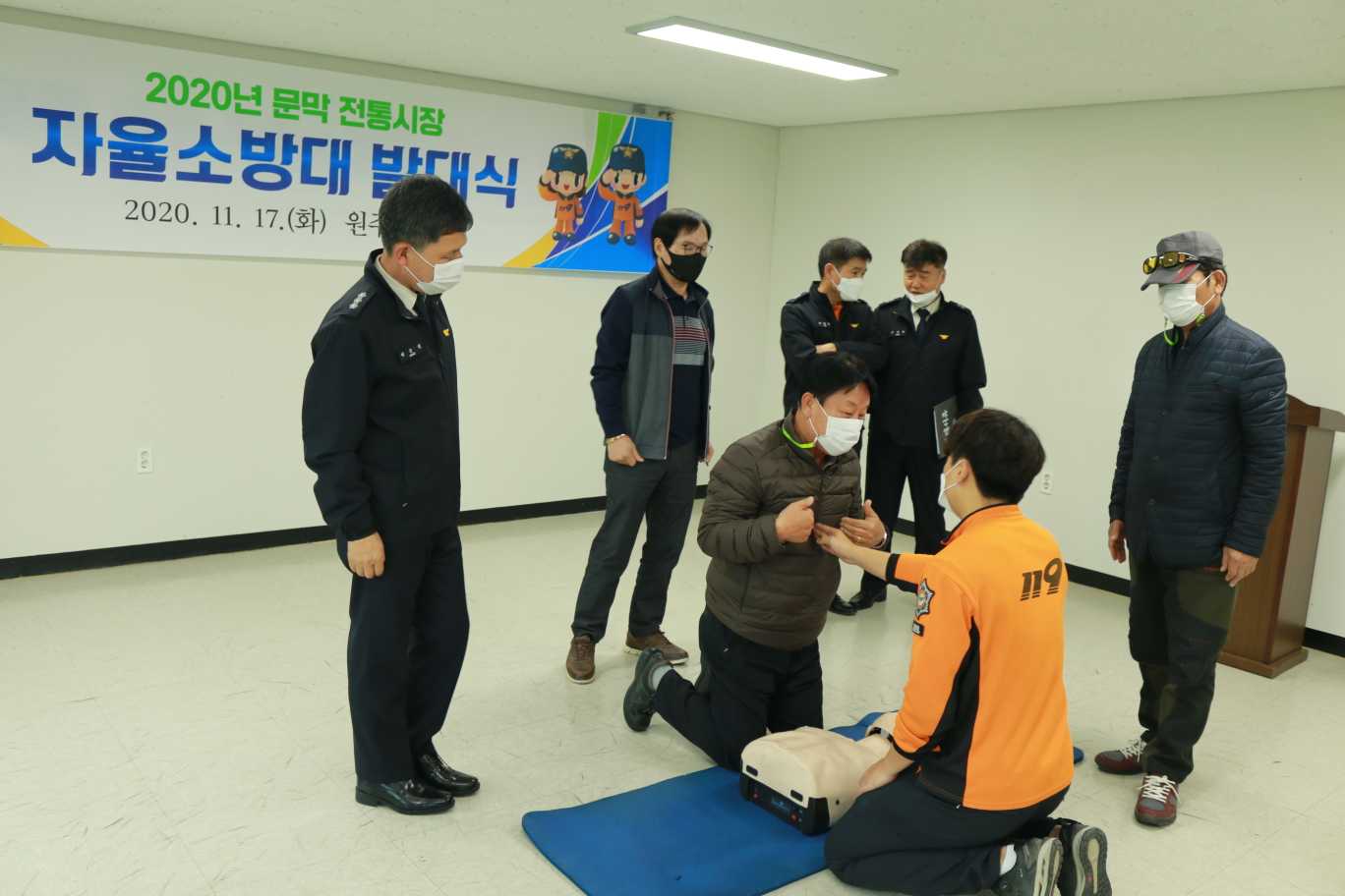 자율소방대는 이날 개인 임무별 활동내용과 소방시설 사용 및 관리요령, 심폐소생술 등을 교육 받았으며, 문막 전통시장의 소방안전관리 최일선에 나서 활약할 예정입니다.