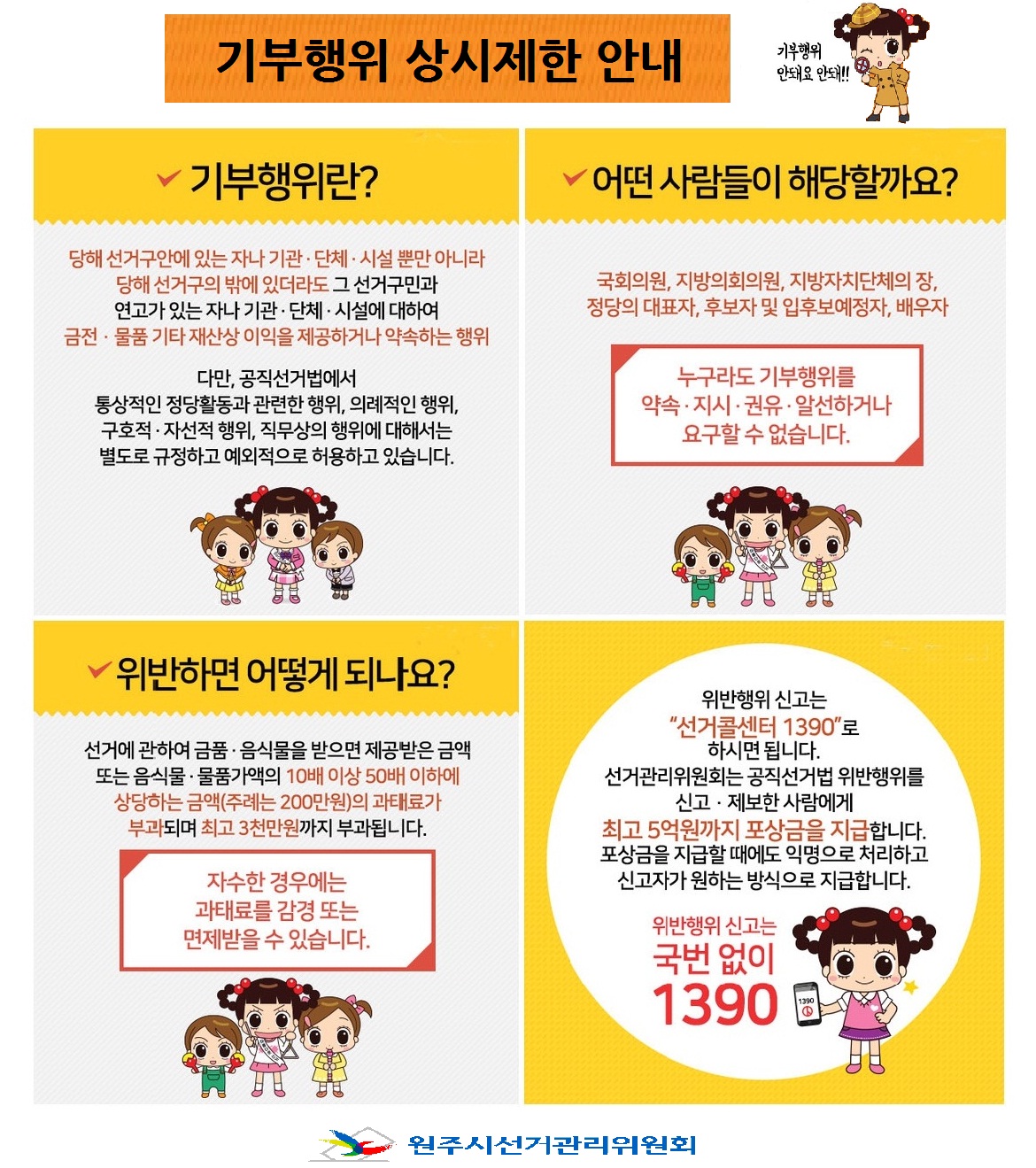 위반행위 신고는 "선거콜센터 1390"로 하시면 됩니다.