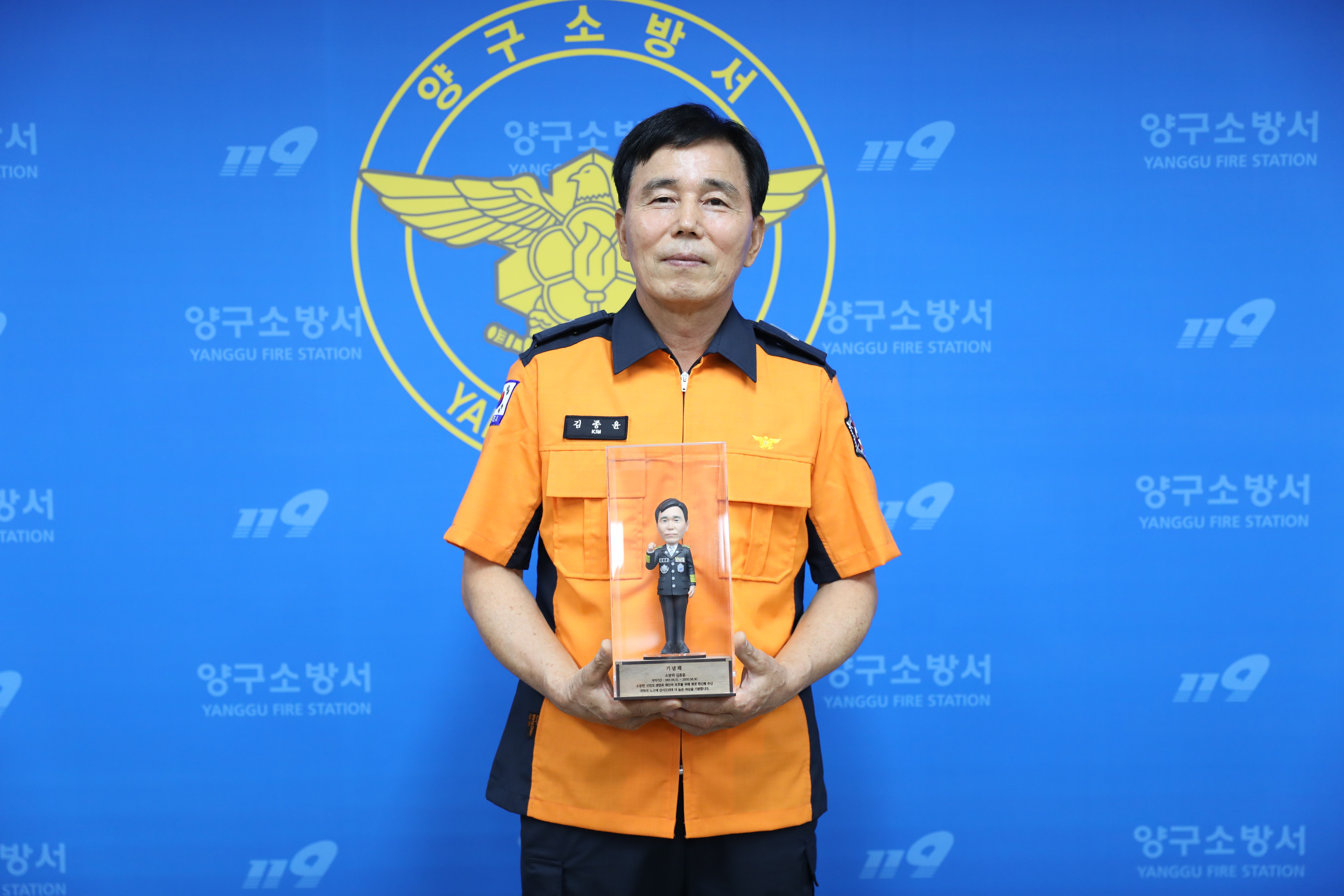 김 소방위는 정부포상으로 옥조근정훈장과 함께 도지사 공로패와 소방본부장의 감사장을 받았으며, 소방서에서는 기념패와 직원들의 감사의 마음을 담은 전신 피규어를 제작해 전달했다.