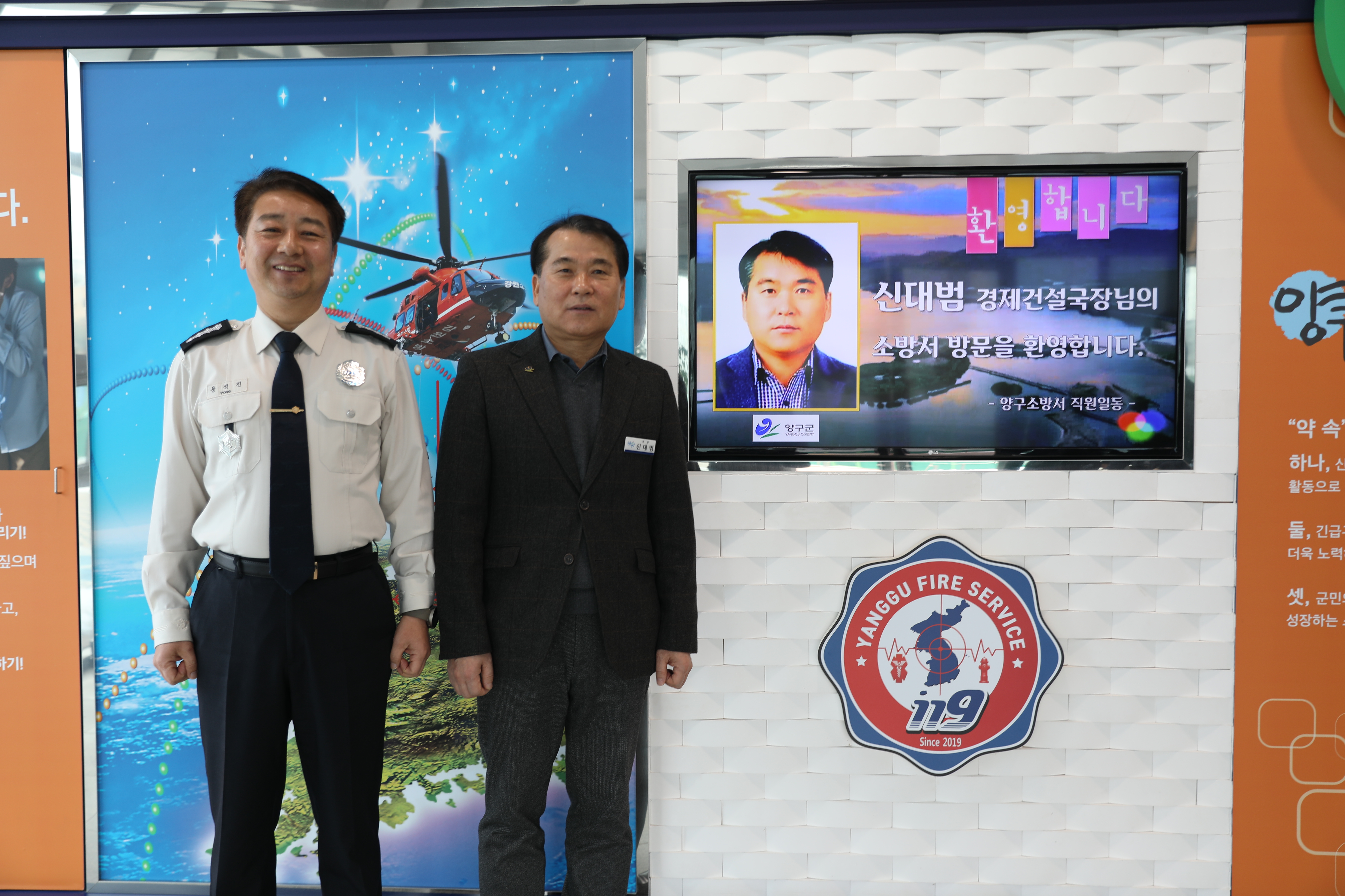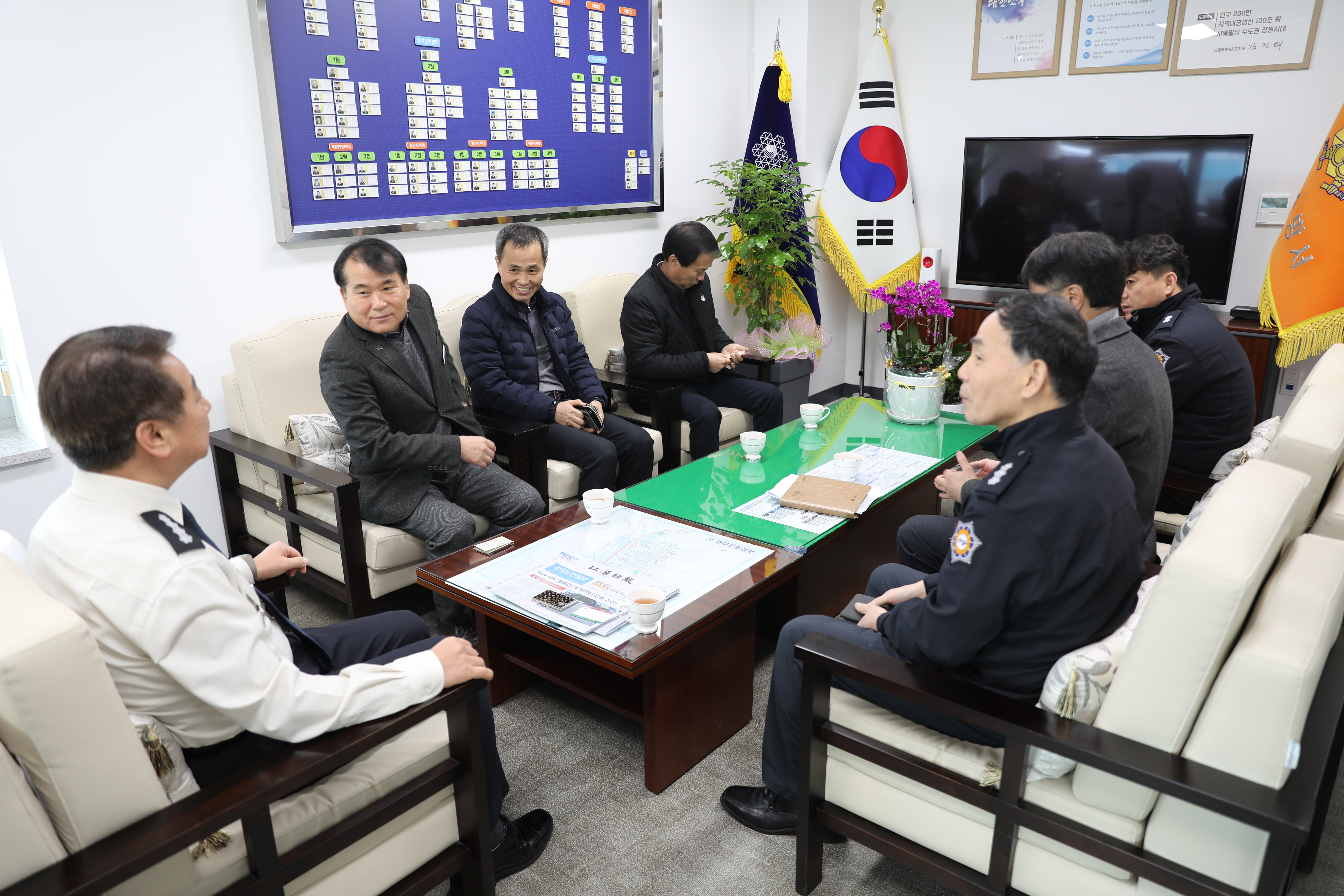 이 날 용석진 서장은 신대범 경제건설국장(이하 국장)을 맞아 서장실에서 차담회를 가졌으며, 양구군과 소방이 협력하여 함께 나아갈 방향에 대해 논의하는 등 다방면으로 회의를 진행했다.