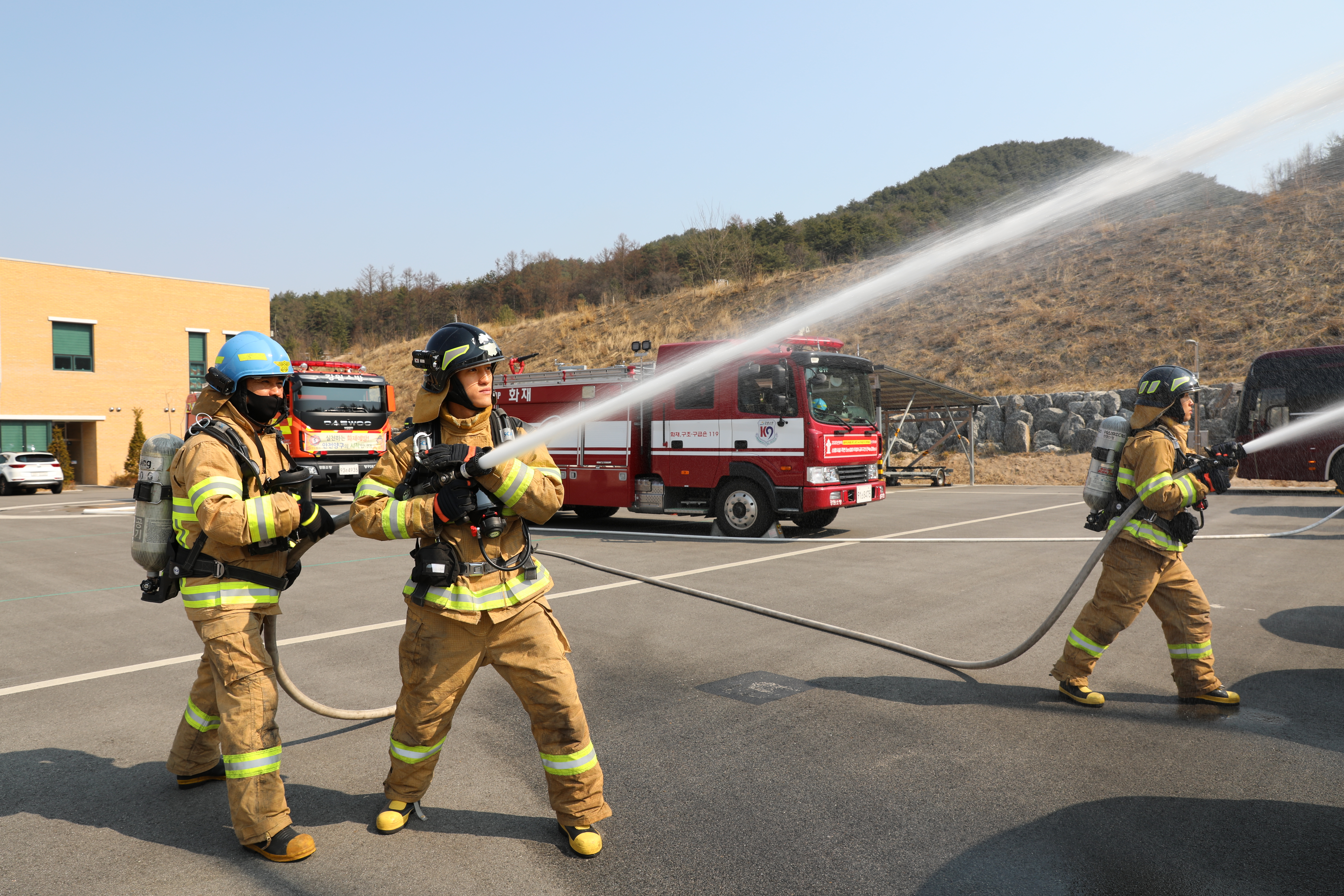 신임소방공무원들이 현장안전점검관의 감독 아래 방수훈련을 실시하고 있다.