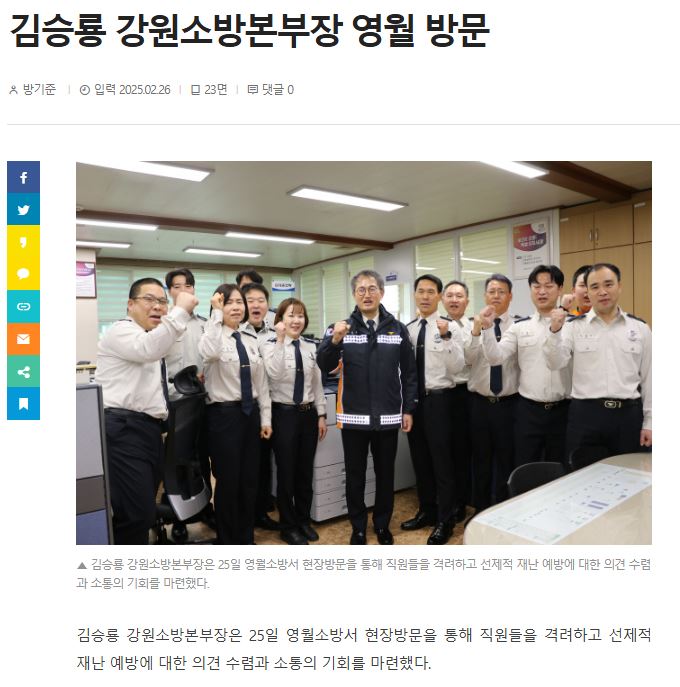 김승룡 강원소방본부장은 25일 영월소방서 현장방문을 통해 직원들을 격려하고 선제적 재난 예방에 대한 의견 수렴과 소통의 기회를 마련했다.