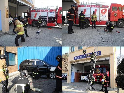 영월소방서(서장 김남백) 119구조대에서는 2012. 2. 22.(수) 구조대 청사 앞에서 유압장비, 체인톱, 에어백, 2단사다리를 이용하여 각종 상황에 맞는 전술훈련을 하였습니다.