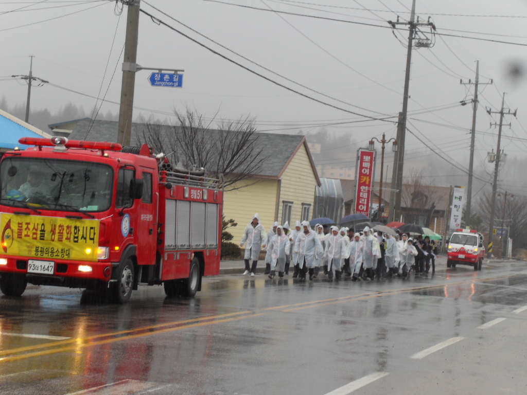영월소방서 봉평의용소방대에서는 15일 11시부터 면사무소직원들과 함께 소방펌프차량 및 면사무소 산불진화차량을 동원하여 봉평시내 일원에 산불예방 홍보방송 및 화재예방 전단지 배부 등 캠페인을 실시하였습니다.