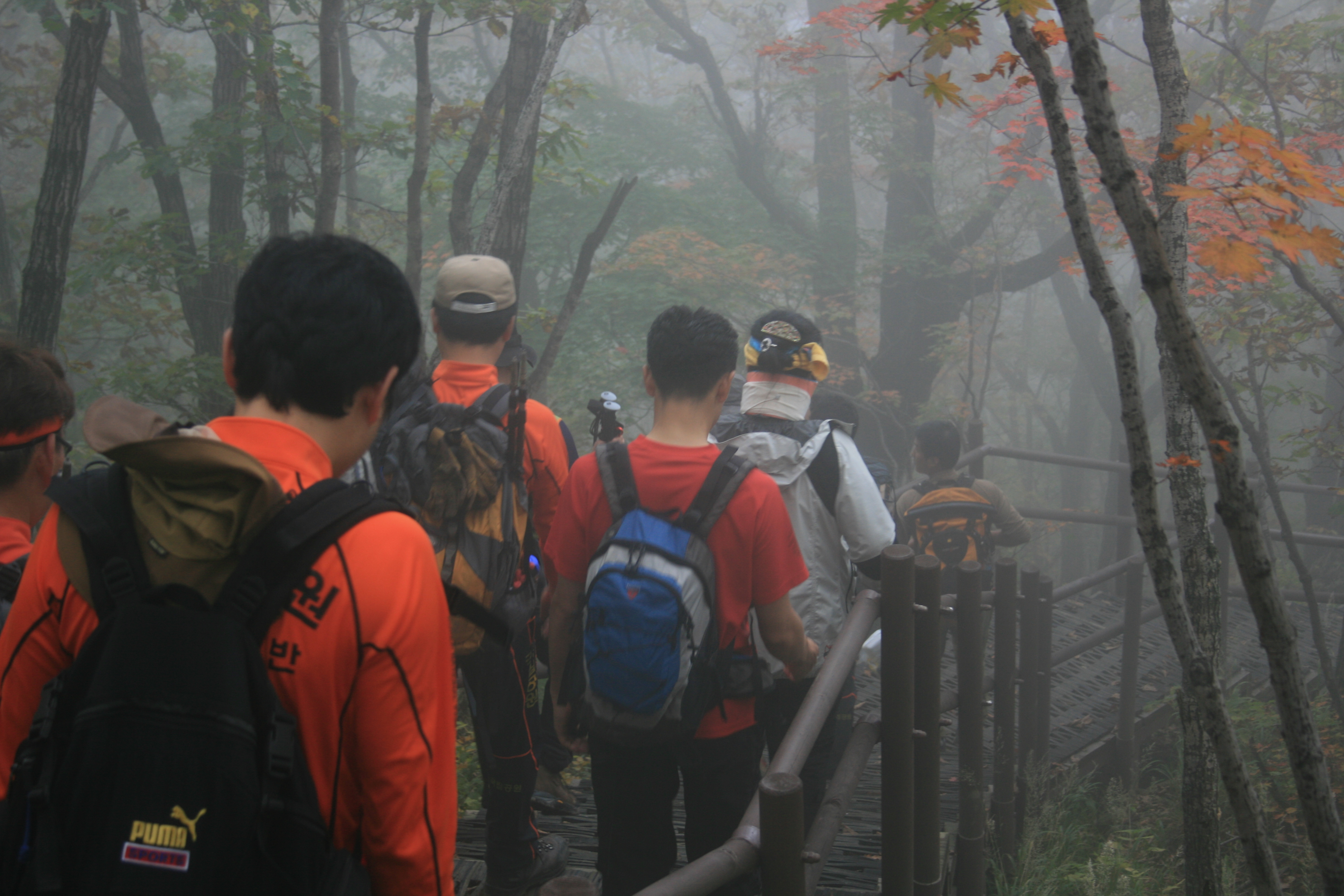 오늘 오후 오대산 "노인봉" 산악구조출동이 떨어졌다. 진부센터 직원2명과 같이 신속하게 진고개정상까지 산악구조차를 타고 가서 완전 산악구보정도로 뛰다 시피 노인봉을 향해 달려갔다. 진고개에서 노인봉정상까지 3.9km. 정상까지 1시간만에 올라갔다. 다행히 오대산 국립공원직원들이 오늘 노인봉일대 산행을 하다가 사고소식을 접하고 신속히 출동 및 119 신고와 함께 !!! 다행이 현장에 도착하니공단직원분들이 응급처치(지혈 및 부목)를 한 상태였다. 아주머니가 정상주변 바위에서 실족하면서 두부열상과 함께 ~많은 피를 흘린상태. 머리만 다쳤지 다리는 괜찮아 걷는대는 문제가 없었다. 헬기도 짙은 운무로 올수 없다고 하고,,,,,천만다행이었다. 급한마음에 노인봉까지 오르면서 보지 못한 예쁜 단풍들이 하산하면서 눈에 들어온다. 이미 온 산이 빠알간 물결이다......