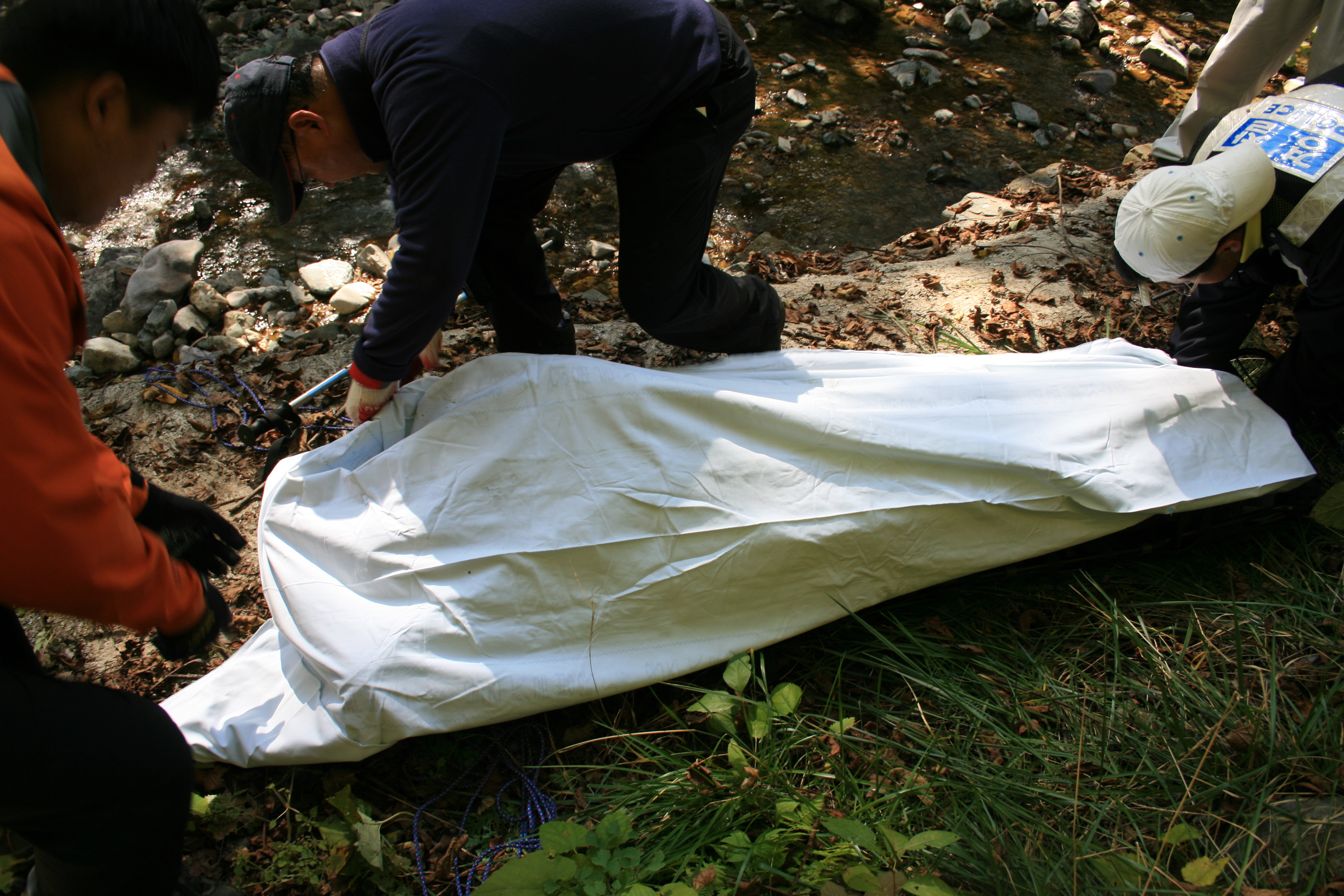 어제아침 송이채취하러 집을 나가셨던 70대 할아버지가 귀가하지 않았다는 신고가 어제저녁 9시쯤 들어왔습니다. 센터 직원2명이 산악구조차를 이용 박지산일원 임도를 한바퀴돌면서 할아버지의 흔적을 찾을려 했지만, 늦은시간과 깜깜한 밤중이라 철수후,,,,,오늘아침 9시부터 다시 저를 비롯한 센터 이강민대원이 경찰과 함께 할아버지의 흔적을 찾아 수색활동을 시작하던중,,,,,가파른 오르막길 능선에서 실족으로 추정되어 나뭇뿌리에 걸려서 사망한 할아버지의 사체를 확인했습니다.........70도이상 가파른 경사길을 산악용들것에 단단히 결착한 후,,,,로프를 이용 중심을 잡아가면서 200미터가량을 내려와,,,,,,인양작업을 완료했구요...지난밤 근무후 쉬지도 못하고 곧장 수색작업에 임한 이강민대원에게 센터장으로써 미안한 마음 뿐입니다.