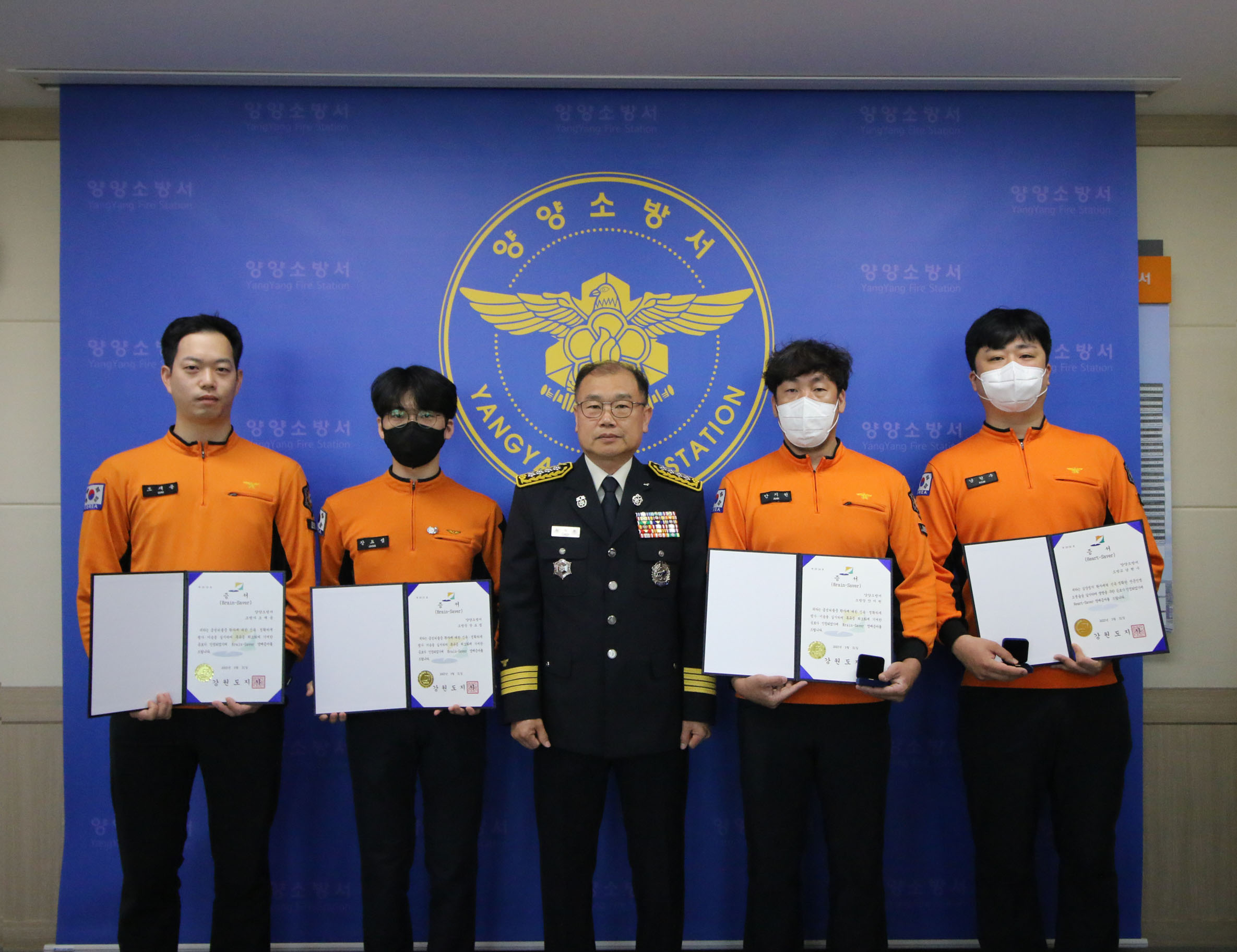 양양소방서 5월 9일 오전 구급대원 4명에게 하트세이버와 브레인세이버를 수여했다.
