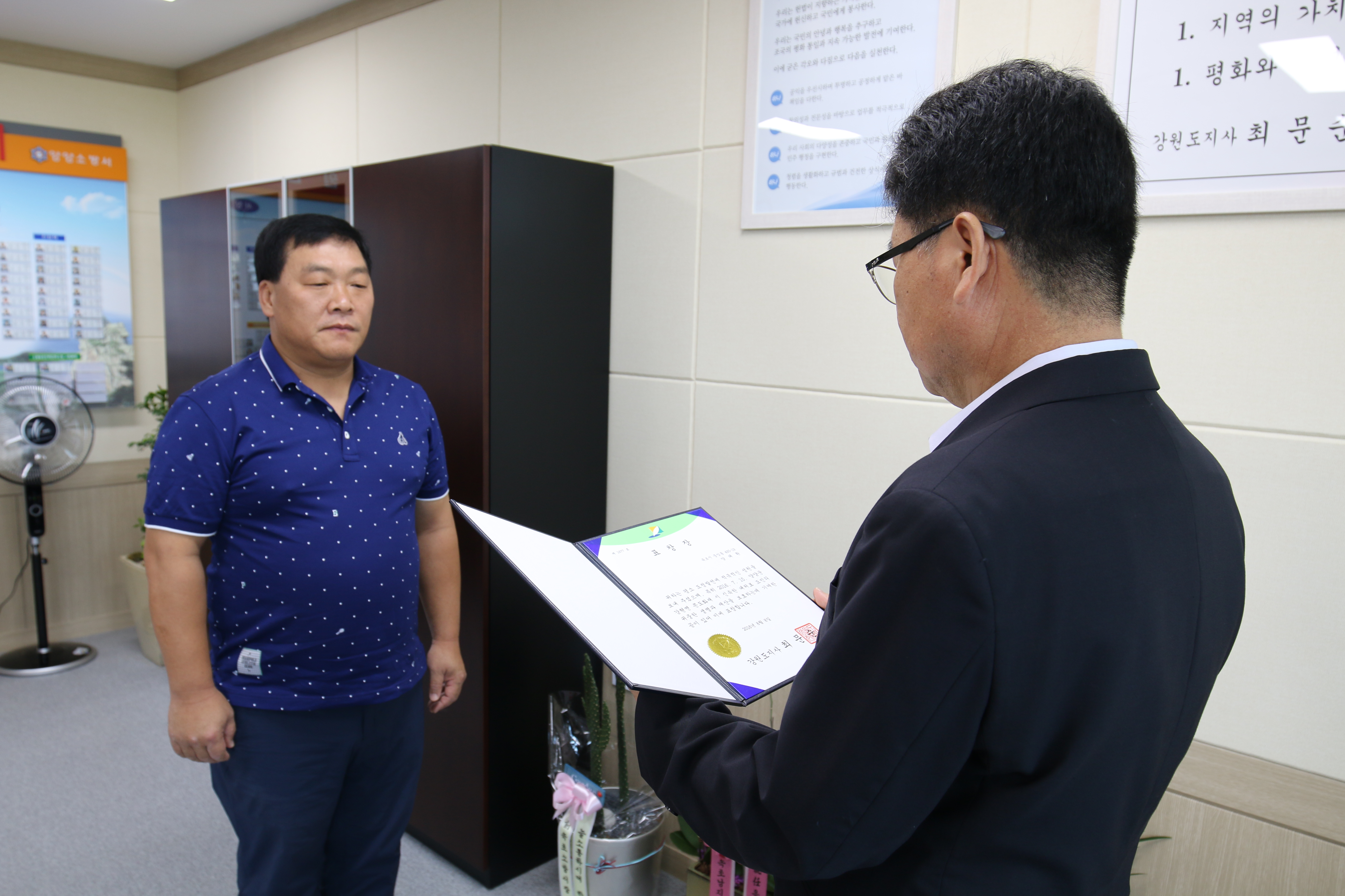 양양소방서(서장 이수남)는 8일 오전 9시 집무실에서 강현면 소재 ‘메리엘콘도’ 화재초기진화 유공이 있는 양태환씨에게 도지사 표창장을 전수했다.